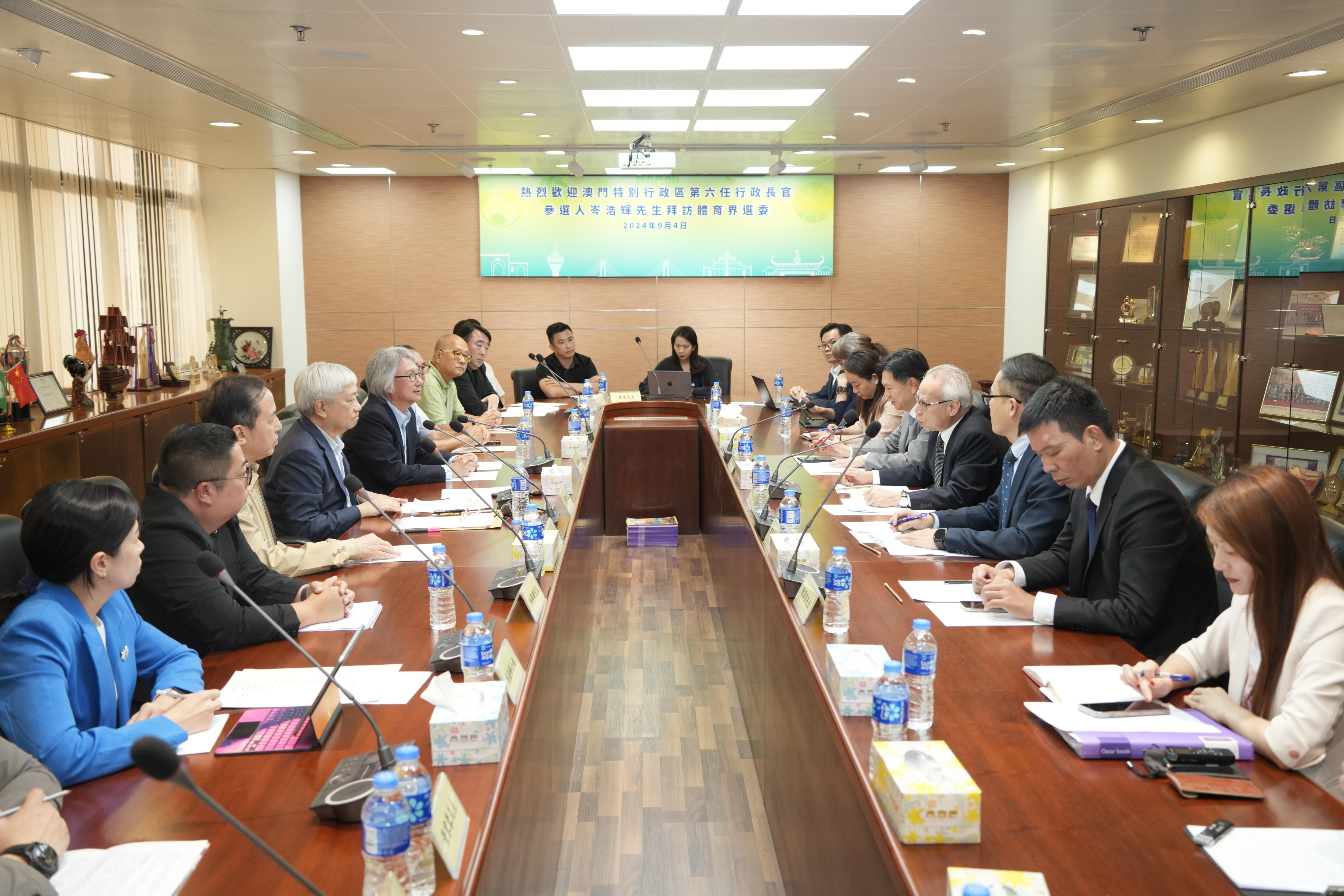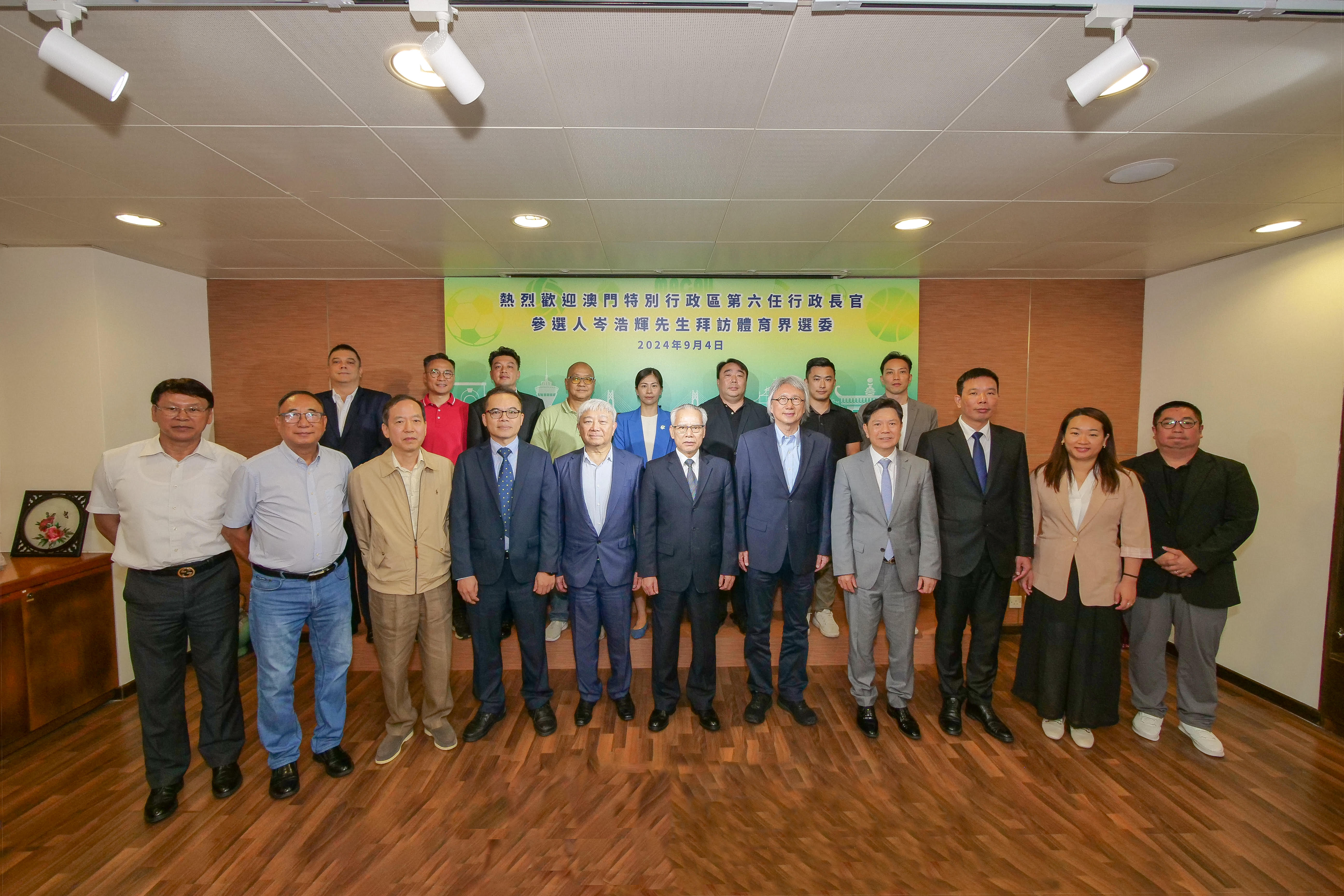 【即時新聞】第六任行政長官參選人岑浩輝在競選辦公室代理人李煥江、主任葉兆佳、副主任陳家良等陪同下,於 9 月 4 日下午 5 時到新口岸獲多利中心拜會 2024 年行政長官選舉委員會體育界選舉委員,爭取委員們的支持,並聽取有關本澳體育事業未來發展的意見和建議。