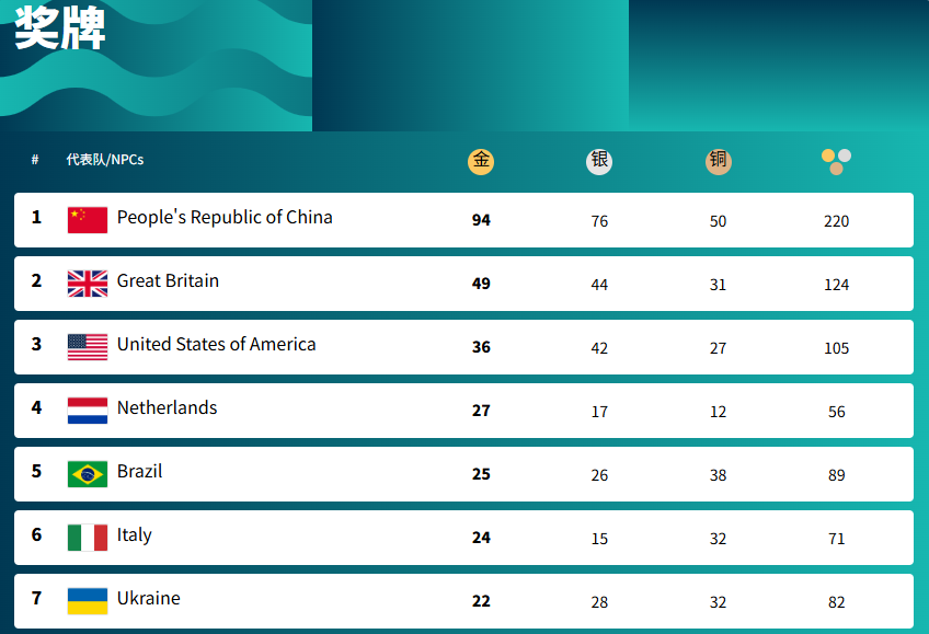 【即時新聞】今日凌晨,第17屆夏季殘疾人奧林匹克運動會大幕落下。中國代表團收穫94金76銀50銅,共計220枚獎牌,圓滿收官。從2004年雅典殘奧會開始,中國連續6屆殘奧金牌榜獎牌榜第一。
