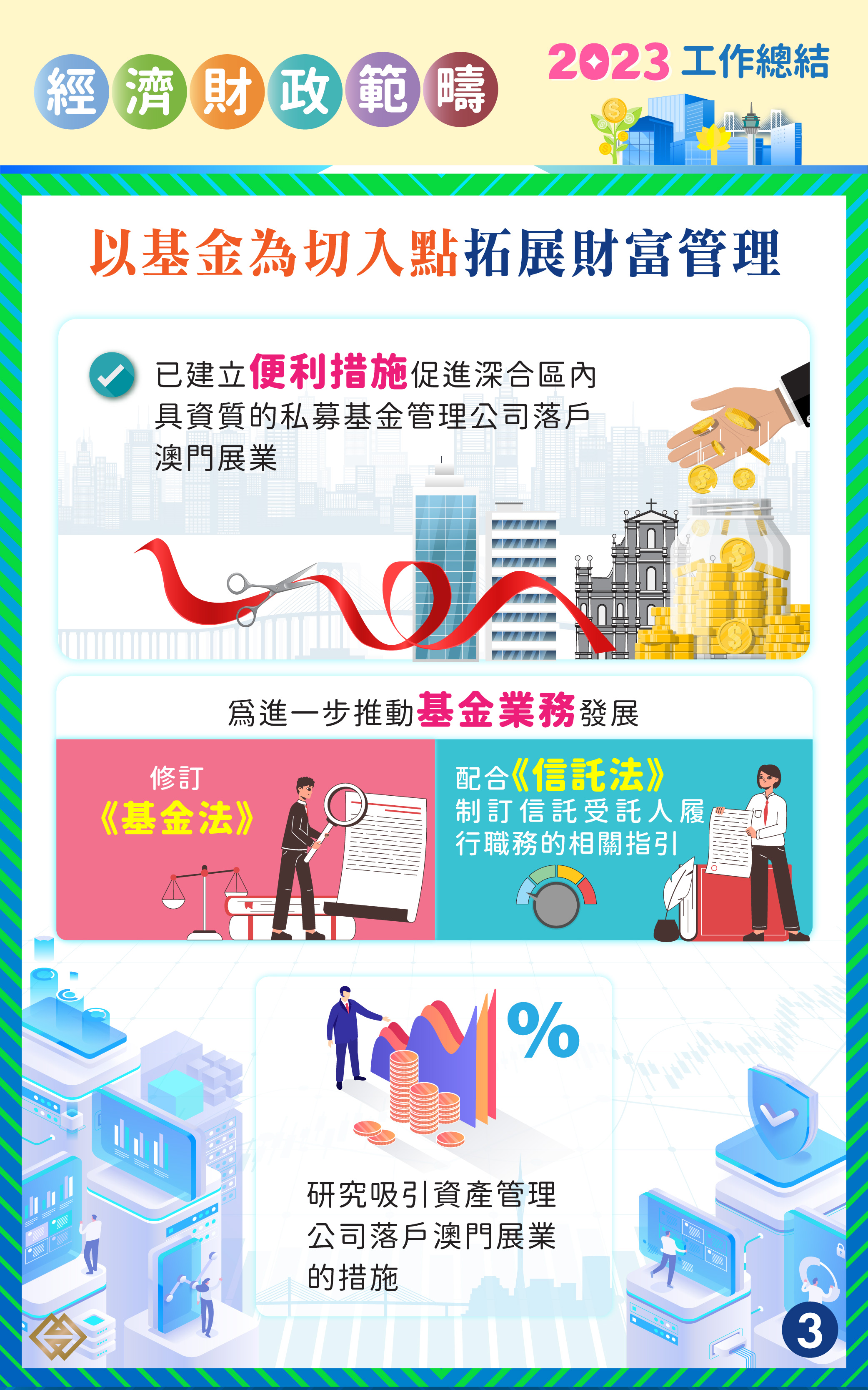 金管局已與深合區相關金融部門建立便利措施,促進深合區內具資質的私募基金管理公司落戶澳門展業。為進一步推動基金業務發展,金管局正推進《基金法》的修訂工作,並配合《信託法》的實施制訂信託受託人履行職務的相關指引;同時研究吸引資產管理公司落戶澳門展業的措施。