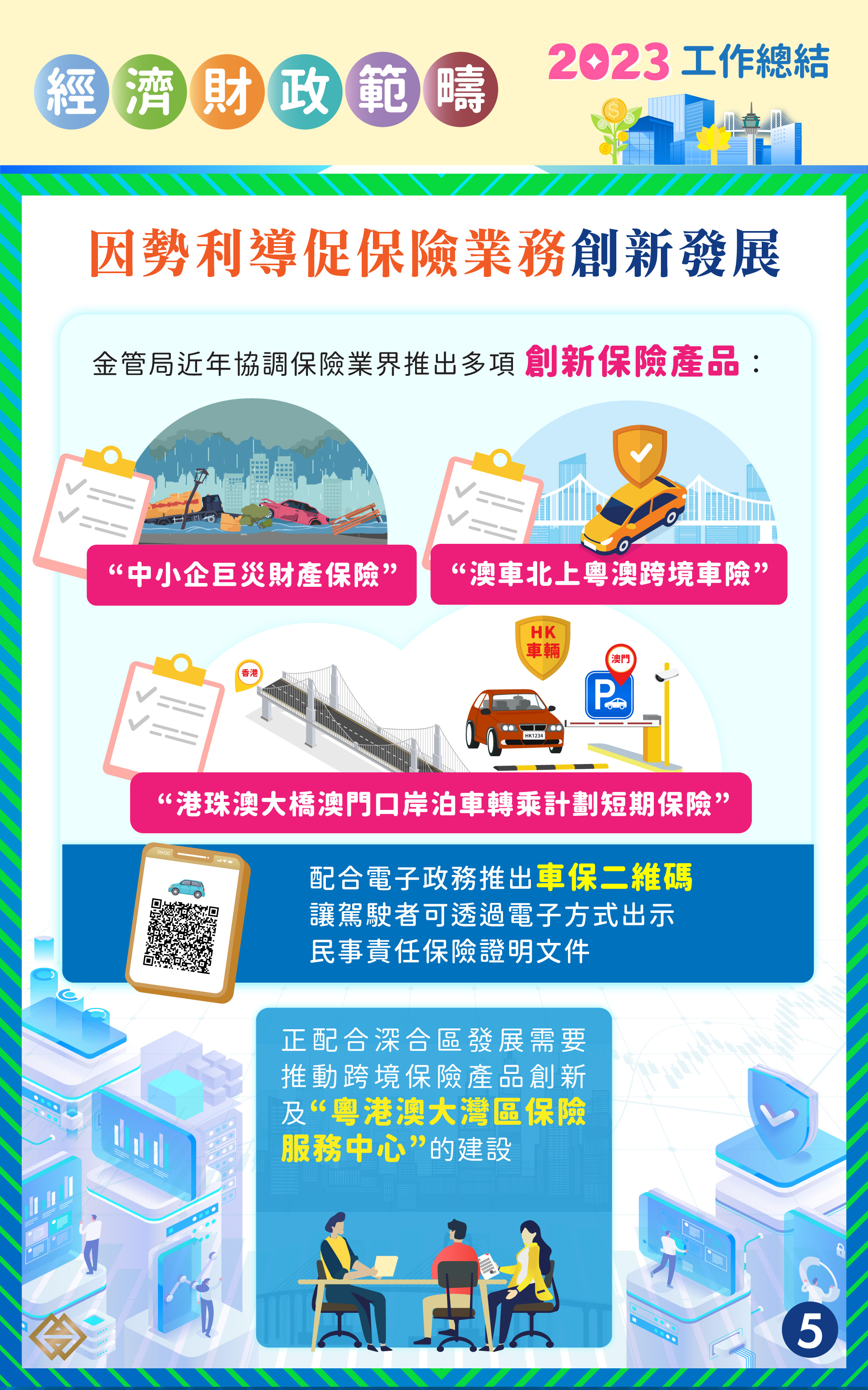金管局近年協調保險業界推出多項創新保險產品,包括“中小企巨災財產保險”、“澳車北上粵澳跨境車險”、“港珠澳大橋澳門口岸泊車轉乘計劃短期保險”,以及配合電子政務發展推出車保二維碼,讓駕駛者可透過電子方式出示民事責任保險證明文件。此外,金管局正配合深合區的發展需要,推動跨境保險產品創新及“粵港澳大灣區保險服務中心”的建設。