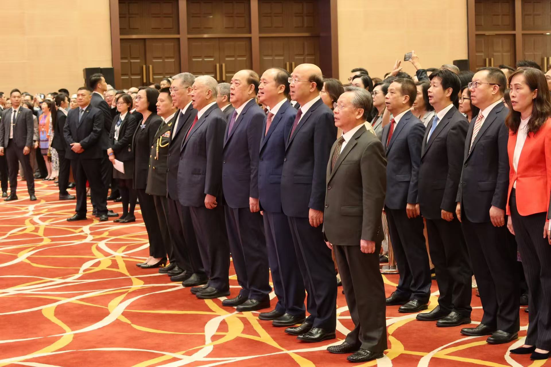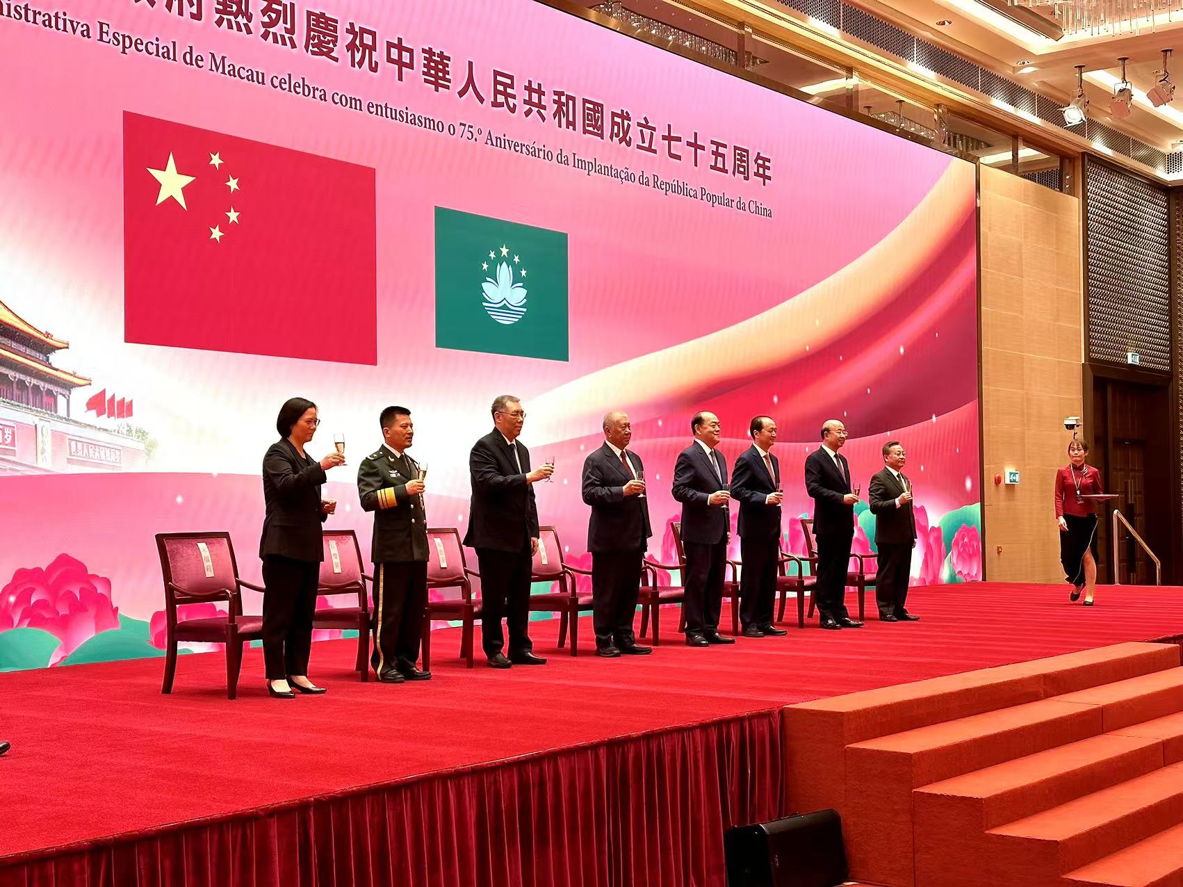 【即時新聞】特區政府上午9時半在中葡平台綜合體舉行慶祝中華人民共和國成立75週年酒會,行政長官賀一誠、全國政協副主席何厚鏵、中聯辦主任鄭新聰、前行政長官崔世安、外交公署特派員劉顯法、駐澳部隊少將政治委員林慶華、立法會主席高開賢、終審法院代院長宋敏莉,以及特區政府主要官員、社會各界約1300人出席。