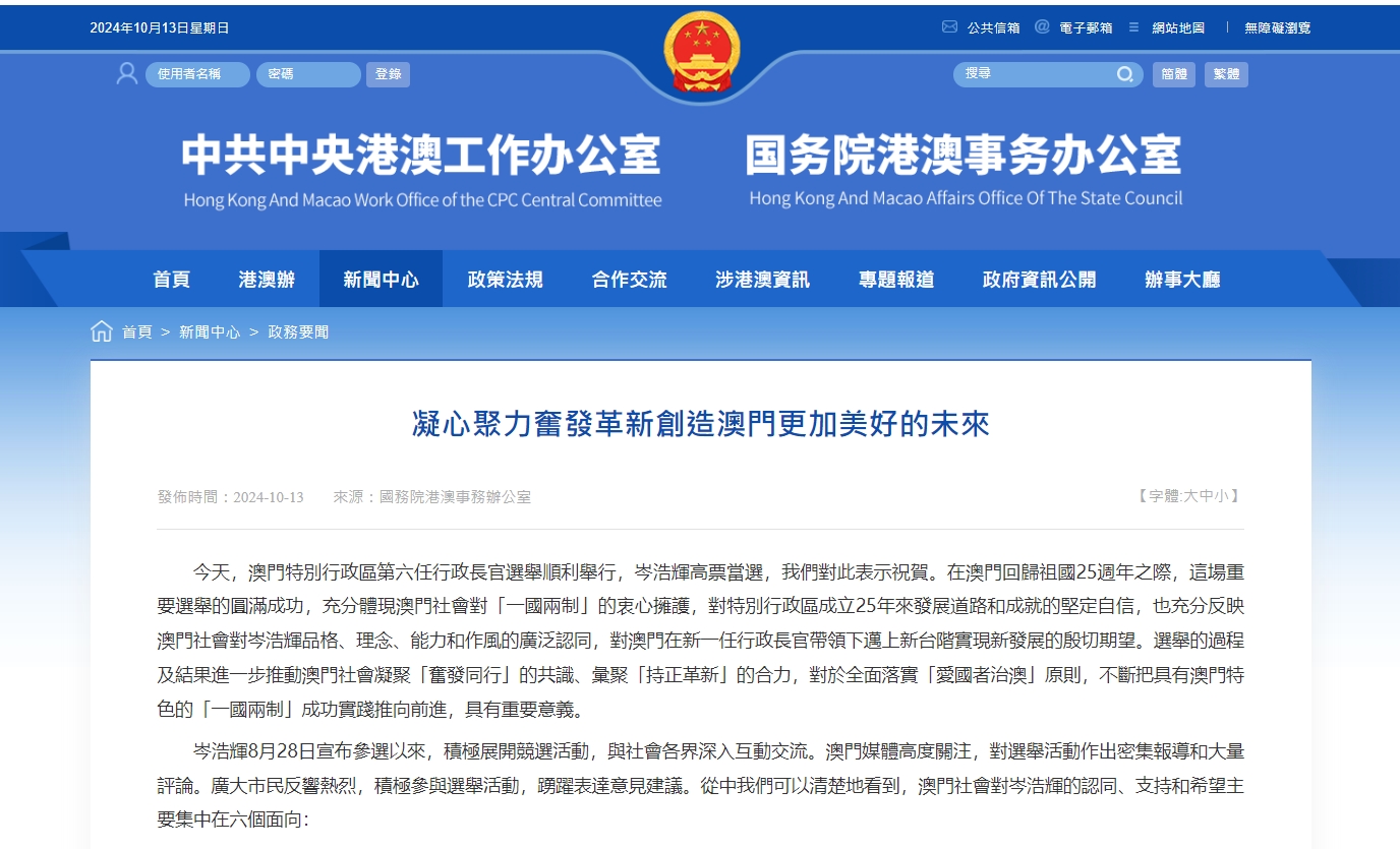 【即時新聞】國務院港澳事務辦公室發表文章稱,今天,澳門特别行政區第六任行政長官選舉順利舉行,岑浩輝高票當選,我們對此表示祝賀。在澳門回歸祖國25周年之際,這場重要選舉的圓滿成功,充分體現澳門社會對“一國兩制”的衷心擁護,對特别行政區成立25年來發展道路和成就的堅定自信,也充分反映澳門社會對岑浩輝品格、理念、能力和作風的廣泛認同,對澳門在新一任行政長官帶領下邁上新台階實現新發展的殷切期望。選舉的過程及結果進一步推動澳門社會凝聚“奮發同行”的共識、彙聚“持正革新”的合力,對于全面落實“愛國者治澳”原則,不斷把具有澳門特色的“一國兩制”成功實踐推向前進,具有重要意義。