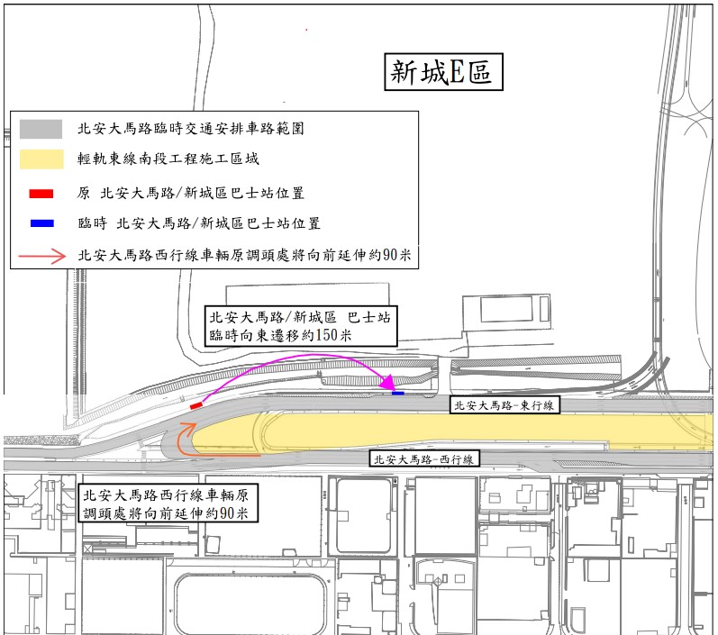 【即時新聞】配合公共建設局輕軌東線南段設計連建造工程於北安大馬路之明挖隧道段施工,北安大馬路將實施臨時交通調整及安排: