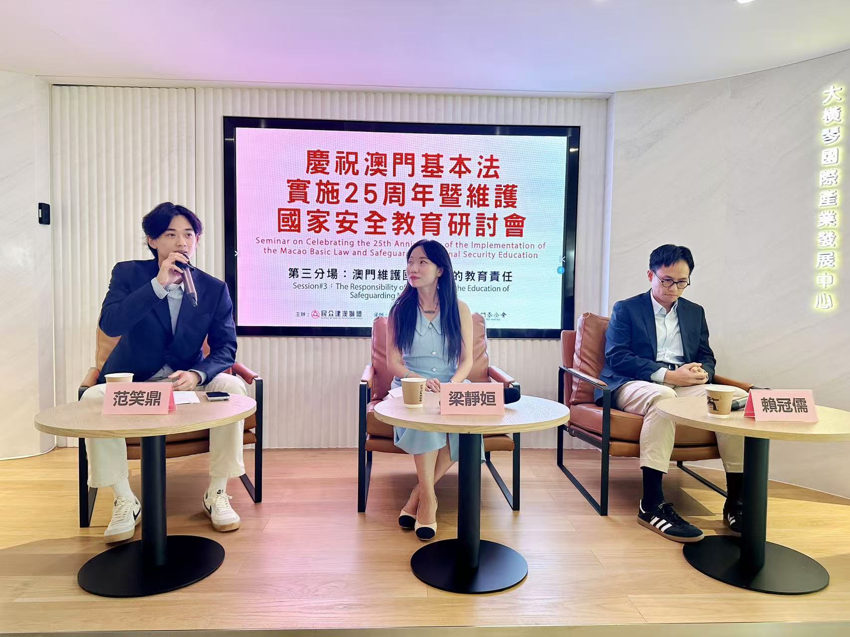 【即時新聞】由民眾建澳聯盟主辦、民眾法律促進會承辦之「慶祝澳門基本法實施25週年暨維護國家安全法」研討會的第三分場—「澳門維護國家安全的教育責任」下午舉行,邀請法律專家學者與會及分享見解,攜手為法治建設貢獻出智慧和力量。