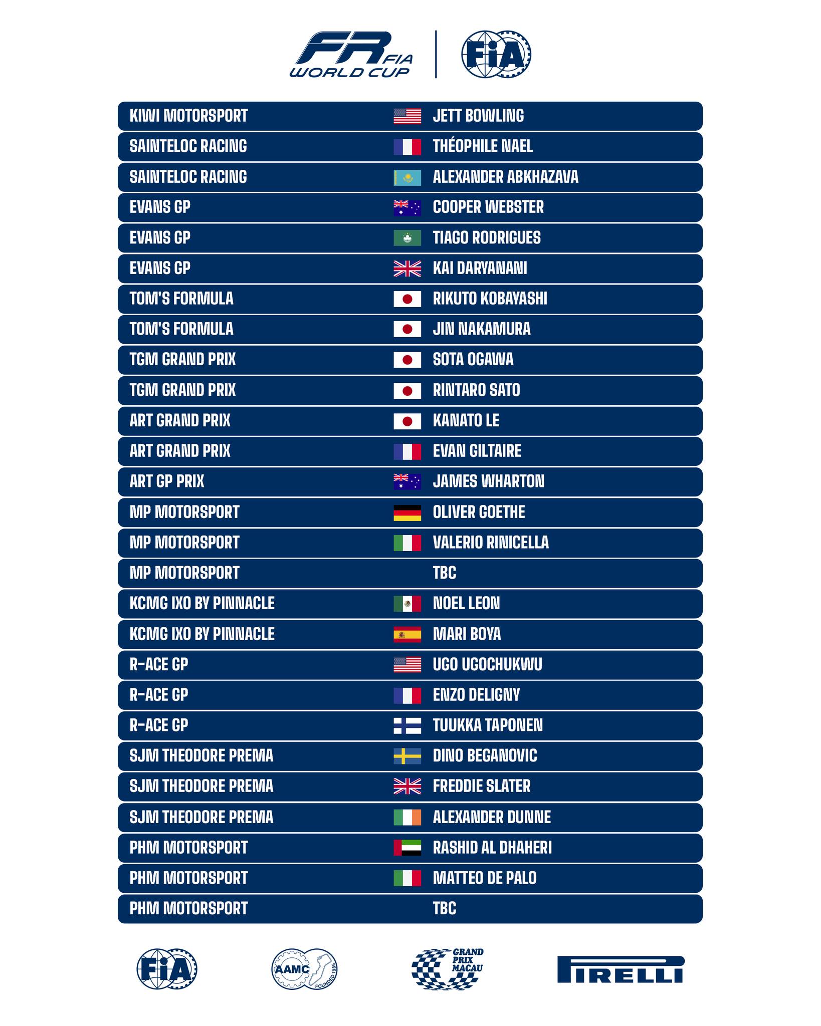 10月22日,在澳門舉行的國際汽聯FR世界盃參賽名單,確認了共有來自十五個國家及地區共二十七名車手,將於11月17日參加標誌性的澳門格蘭披治大賽。