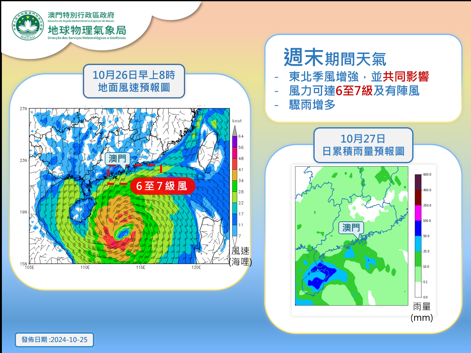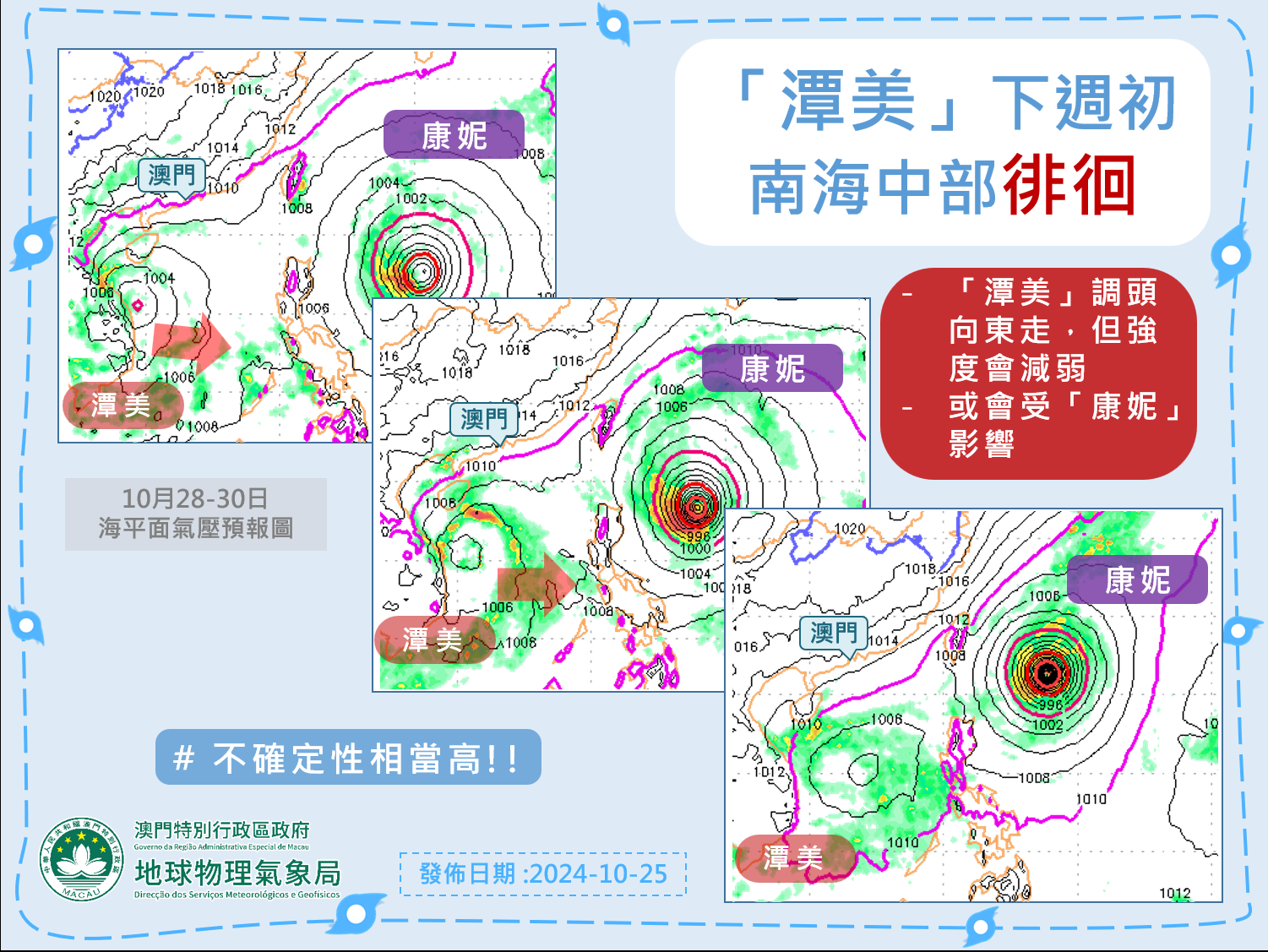 周末期間,「潭美」將繼續向偏西方向移動,強度略為增強,並於本澳以南約500公里範圍掠過,大致移向海南島以南一帶。此外,受東北季風增強的共伴影響,今日(25日)晚間至明日,本澳風勢將較大,風力可達6至7級及有陣風,而周六至周日驟雨將增多。