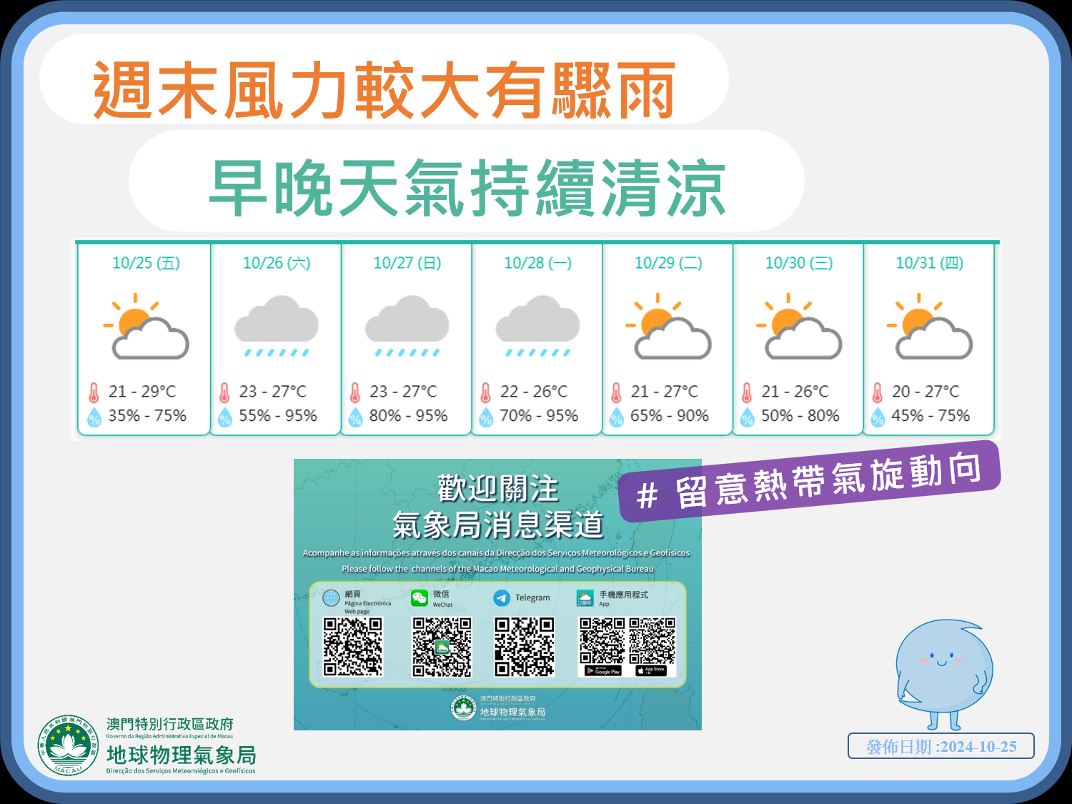展望下周天氣,本澳早晚持續清涼,市民出門宜注意添衣。