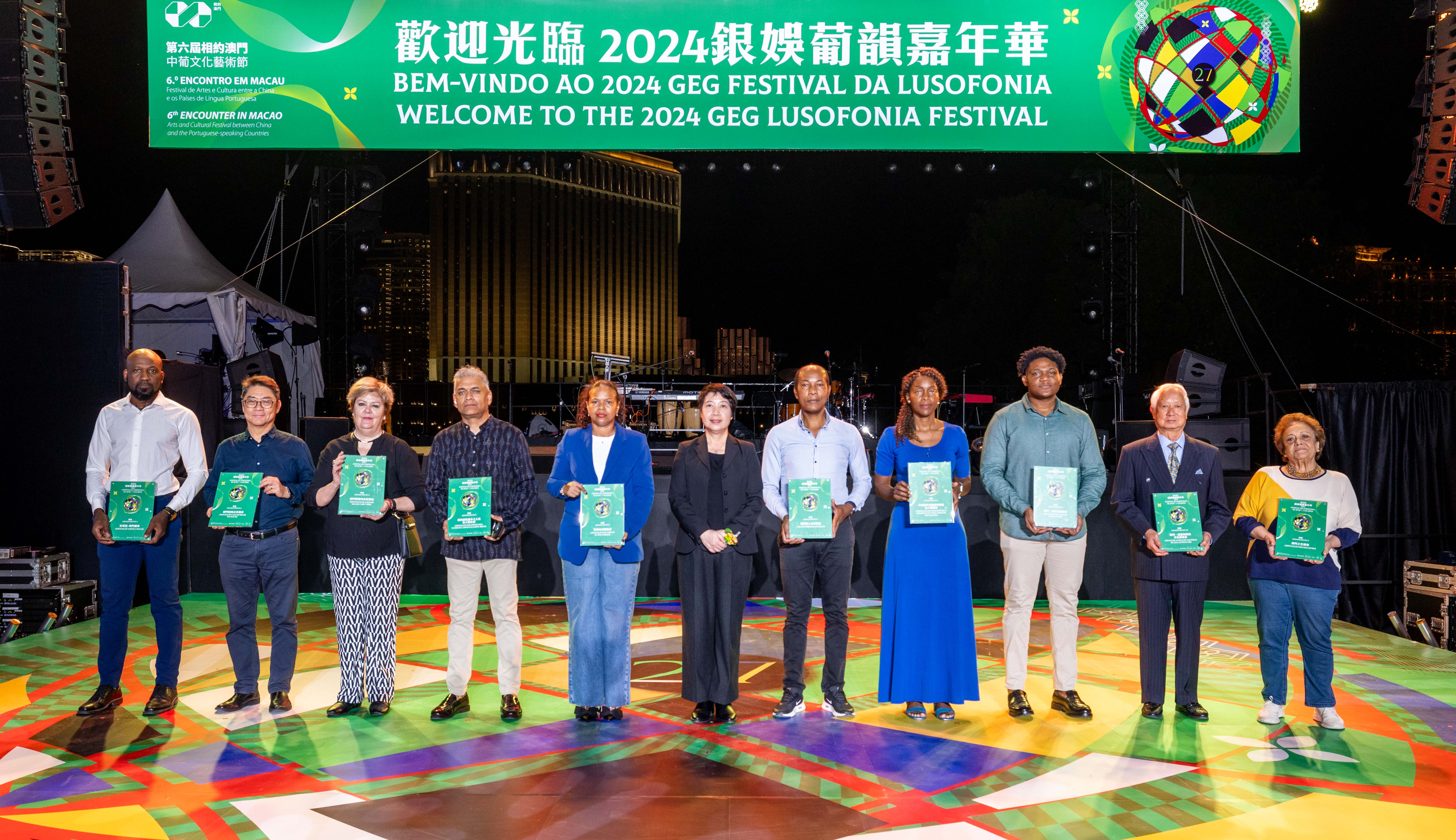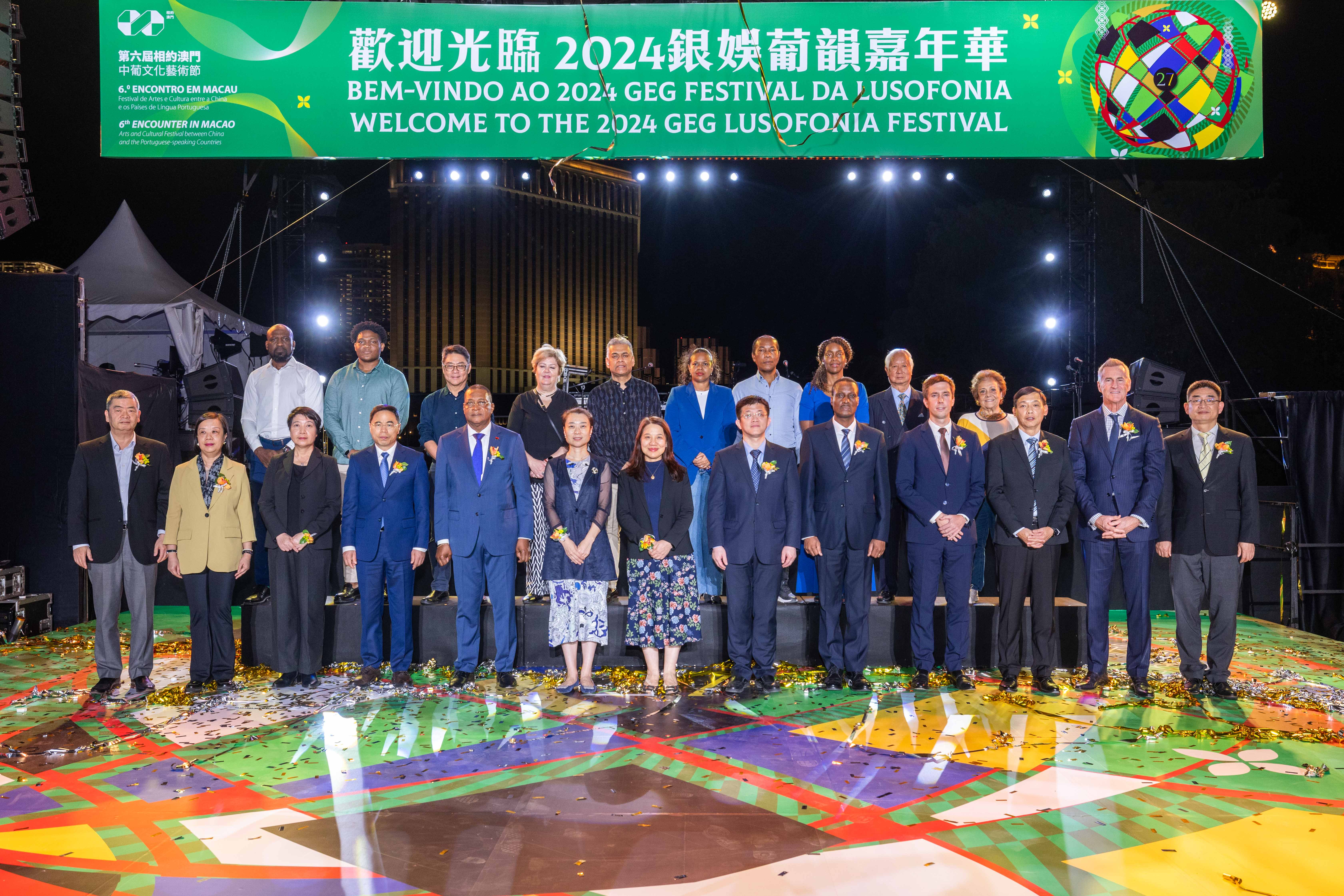 第六屆“相約澳門——中葡文化藝術節”及“2024銀娛葡韻嘉年華”開幕式由社會文化司司長辦公室主任何鈺珊、中央人民政府駐澳門特別行政區聯絡辦公室宣傳文化部副部長白冰、外交部駐澳門特別行政區特派員公署新聞和公共外交部主任高原參贊、安哥拉共和國駐澳門總領事館總領事Eduardo Velasco Galiano、莫桑比克共和國駐澳門總領事館商務代辦Aurélio de Jesus Chiconela、中葡論壇(澳門)常設秘書處秘書長季先峥、葡萄牙駐澳門總領事館商務副領事白納道(Bernardo Pinho)、文化局局長梁惠敏、旅遊局副局長許耀明、澳門廣播電視股份有限公司執行委員會主席羅崇雯、銀河娛樂集團首席營運總監祁嘉杰、市政署文康及公民教育廳代廳長歐振榮及澳門航空股份有限公司受權人張允等主禮,文化發展基金行政委員會陳家耀委員、文化局副局長鄭繼明、永利澳門有限公司市場營銷總裁鄒文瑜,以及多位文化遺產委員會委員及合作單位代表出席觀禮。