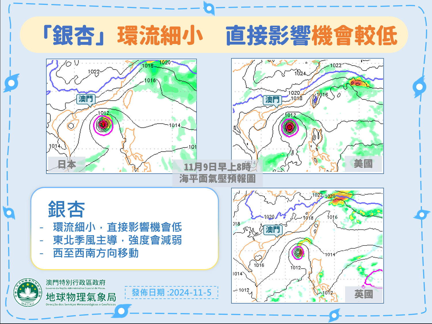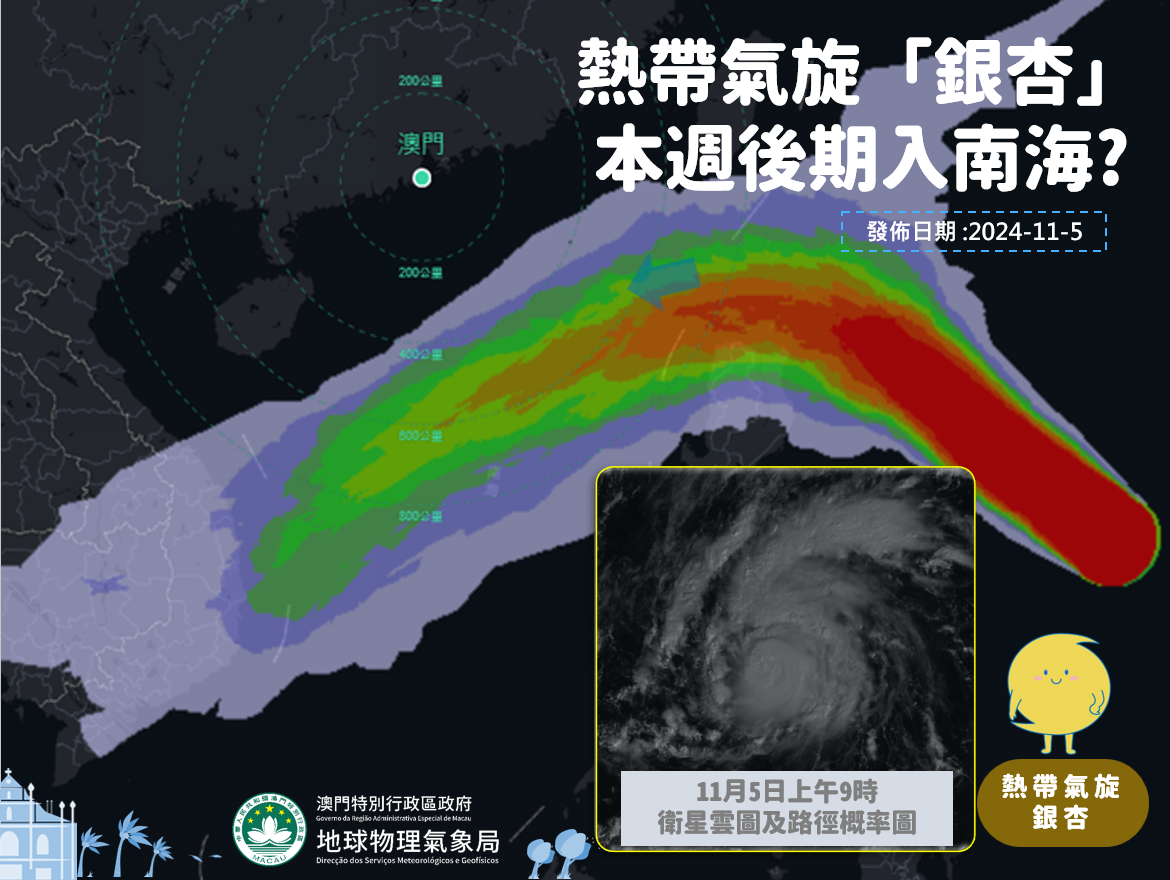 現時東北季風已成為主導南海及西北太平洋的天氣系統,「銀杏」環流細小,其進入南海後將受乾冷的東北季風影響,強度將逐漸減弱。氣象局預料「銀杏」對本澳造成直接影響的機會較低。
