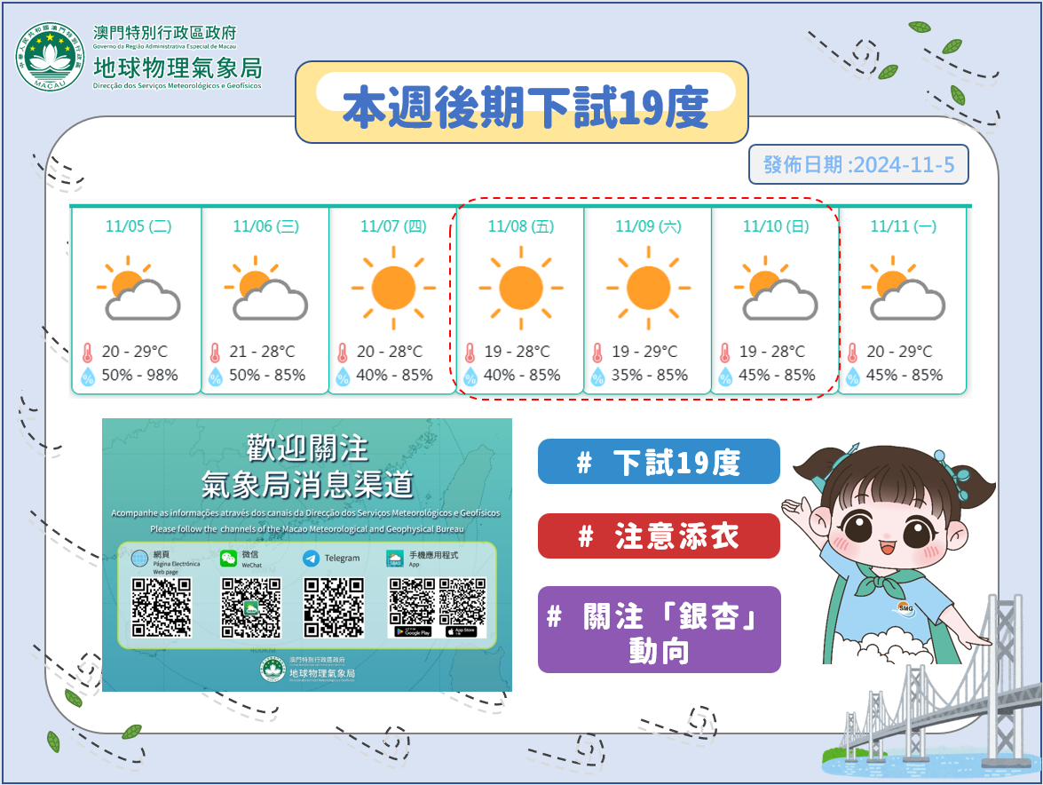 展望未來數日的天氣,因應持續受東北季風影響,本澳早晚天氣清涼,大致天晴及乾燥,本週後期最低氣溫將降至19度左右。呼籲公眾持續關注當局最新的天氣預報,同時出門帶備外套,以免著涼。