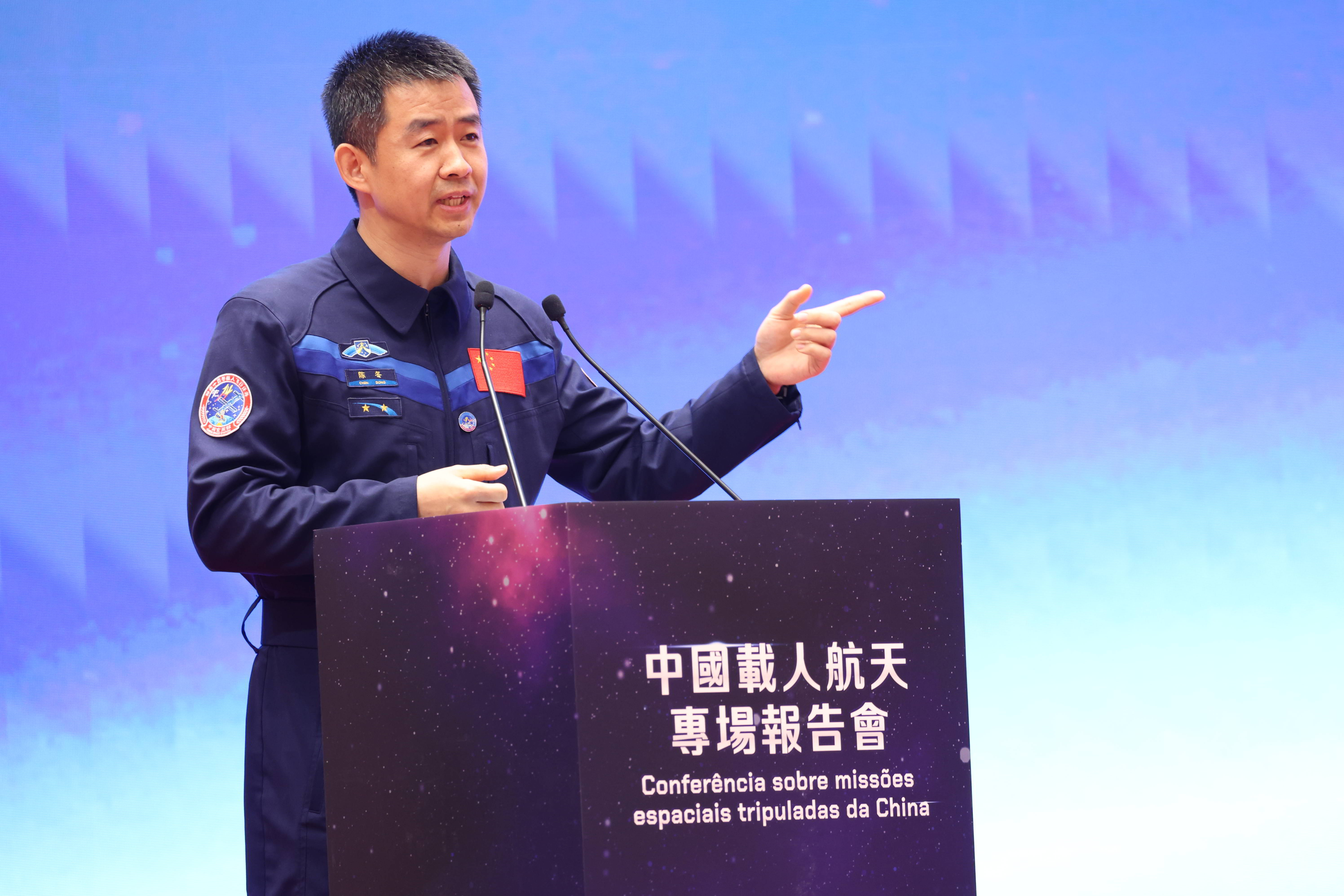 神舟十四號航天員指令長陳冬分享其航天任務、航天生活的經歷和感受,勉勵澳門學生只要肯努力為自己的夢想堅持,就一定能為中國夢貢獻自己的力量,要讓我為祖國感到驕傲,變為祖國為我感到驕傲。空間站系統總設計師楊宏、空間應用系統副總設計師鍾紅恩分別介紹中國載人航天發展戰略、載人航天精神、空間站空間科學與應用規劃和載人月球科學研究與應用等情況。空間站系統總設計師楊宏表示,熱切盼望澳門的載荷專家能夠遨遊太空,共同為建設航天強國,貢獻澳門力量。空間應用系統副總設計師鍾紅恩展望團隊瞄準世界科技前沿和國家重大需求開展研究,為提升人類認知貢獻中國力量。酒泉發射場系統副總指揮王學武報告酒泉衛星發射中心包括衛星、飛船、火箭的測試發射、太空人搜救回收及其他各類科研試驗任務的情況。