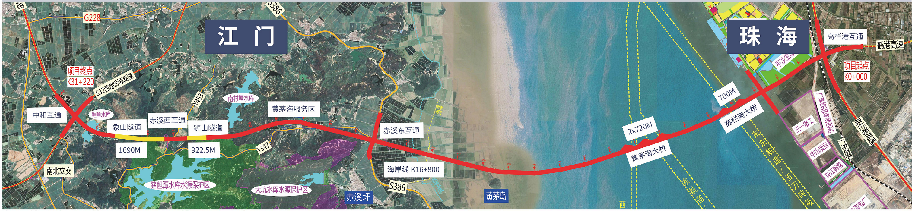 黃茅海跨海通道是《粵港澳大灣區發展規劃綱要》發佈後首個開工的跨海通道工程,也是繼港珠澳大橋、深中通道之後,粵港澳大灣區又一跨海通道重大工程,於2020年6月開工建設。項目通車後,珠海至江門的通行時間從1個多小時縮短至30分鐘左右。項目開通前期,對社會公眾暫免項目道路通行費用,詳細費用待下一步另行公開。