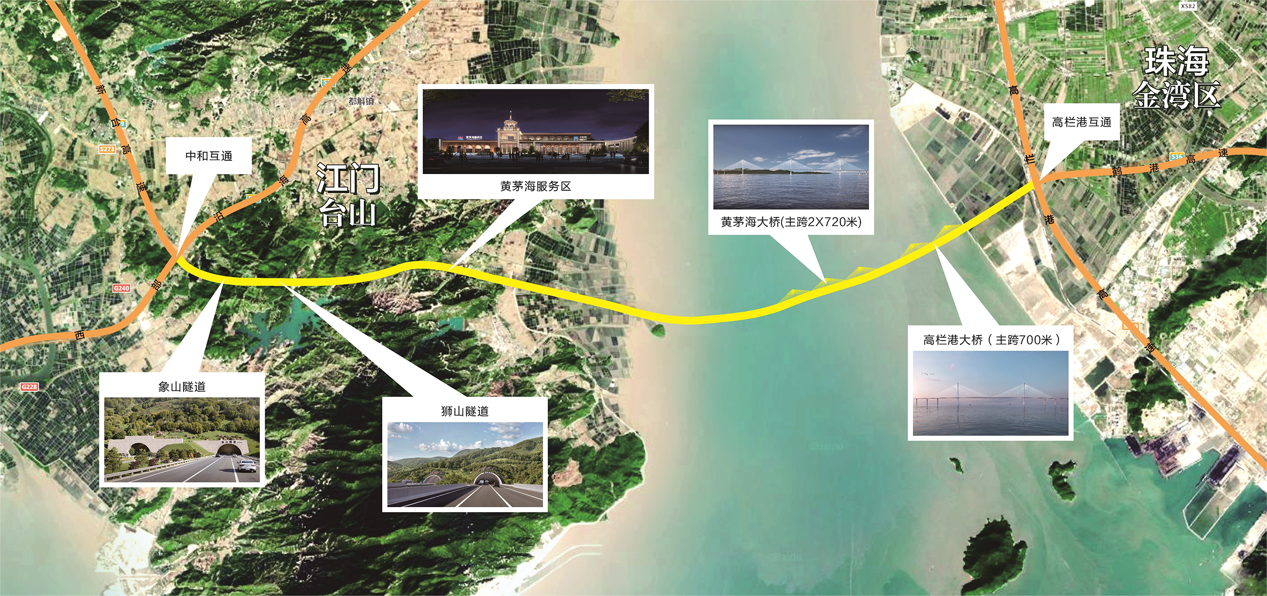 黃茅海跨海通道也是港珠澳大橋的西延線,起於珠海市平沙鎮,終於江門市台山市鬥山鎮,全長約31公里,跨海段長度約14公里,設置高欄港大橋(主跨700米雙塔單跨)、黃茅海大橋(2×720米三塔雙跨斜拉橋)2座主橋,隧道2座,互通4座,服務區1處,其中,黃茅海大橋是目前已建成的世界上跨徑最大的三塔斜拉公路橋。
