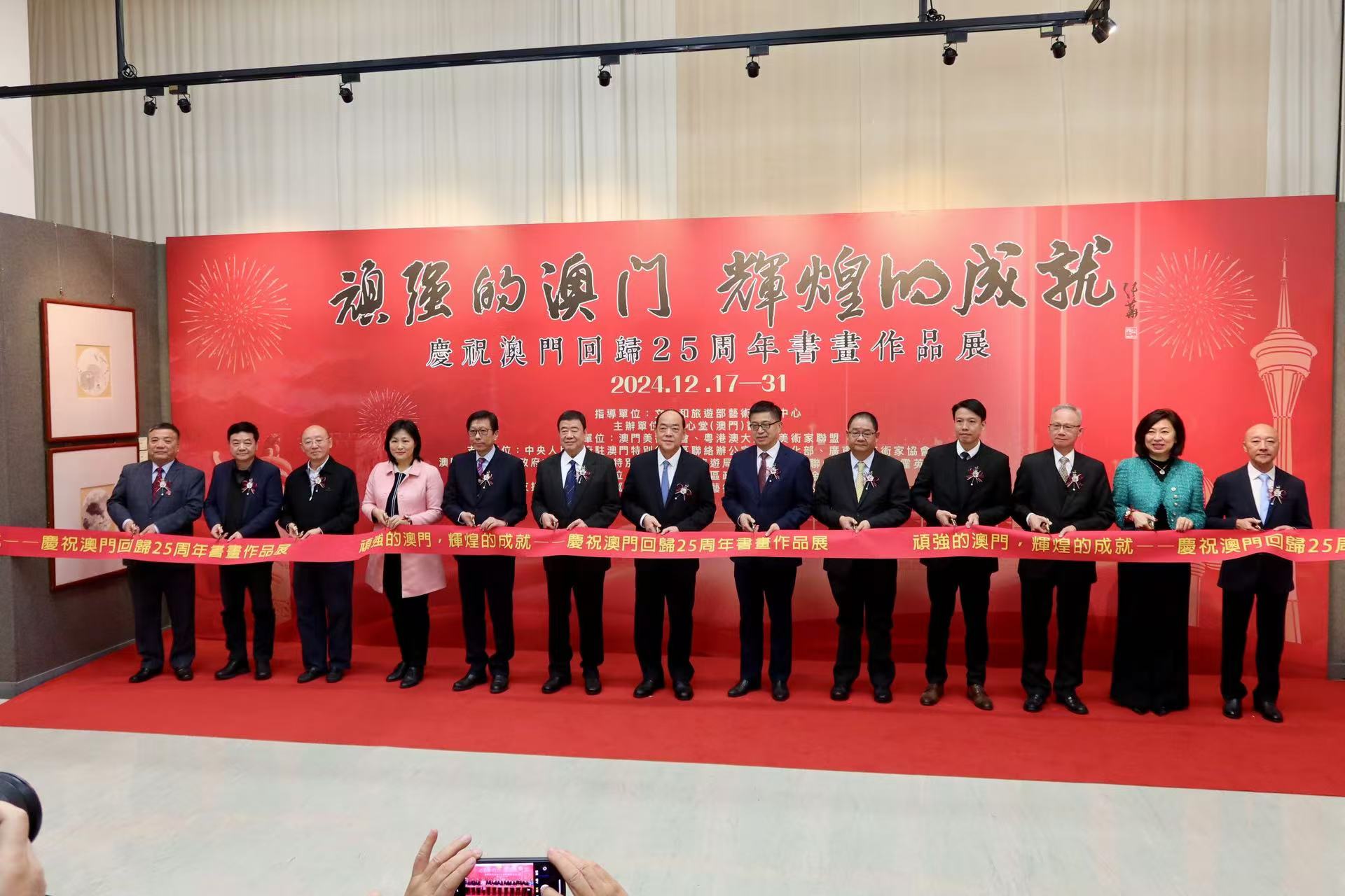 【即時新聞】賞心堂(澳門)書畫會主辦的“頑強的澳門,輝煌的成就——慶祝澳門回歸25周年書畫作品展”大型展覽今日傍晚在教科文中心揭幕,行政長官賀一誠出席主禮剪綵儀式。展覽匯聚全國各地近百位名家,緊扣主題創作的逾百幅書畫精品,用筆墨勾勒出一首時代讚歌,藉此表達藝術家們對祖國75周年華誕及澳門回歸25年來所取得的輝煌成就的崇高敬意,作為一份充滿深情厚誼的獻禮,展現他們對祖國深切的熱愛和赤誠之心,以及對澳門過去25年發展變化的高度認可與讚美。