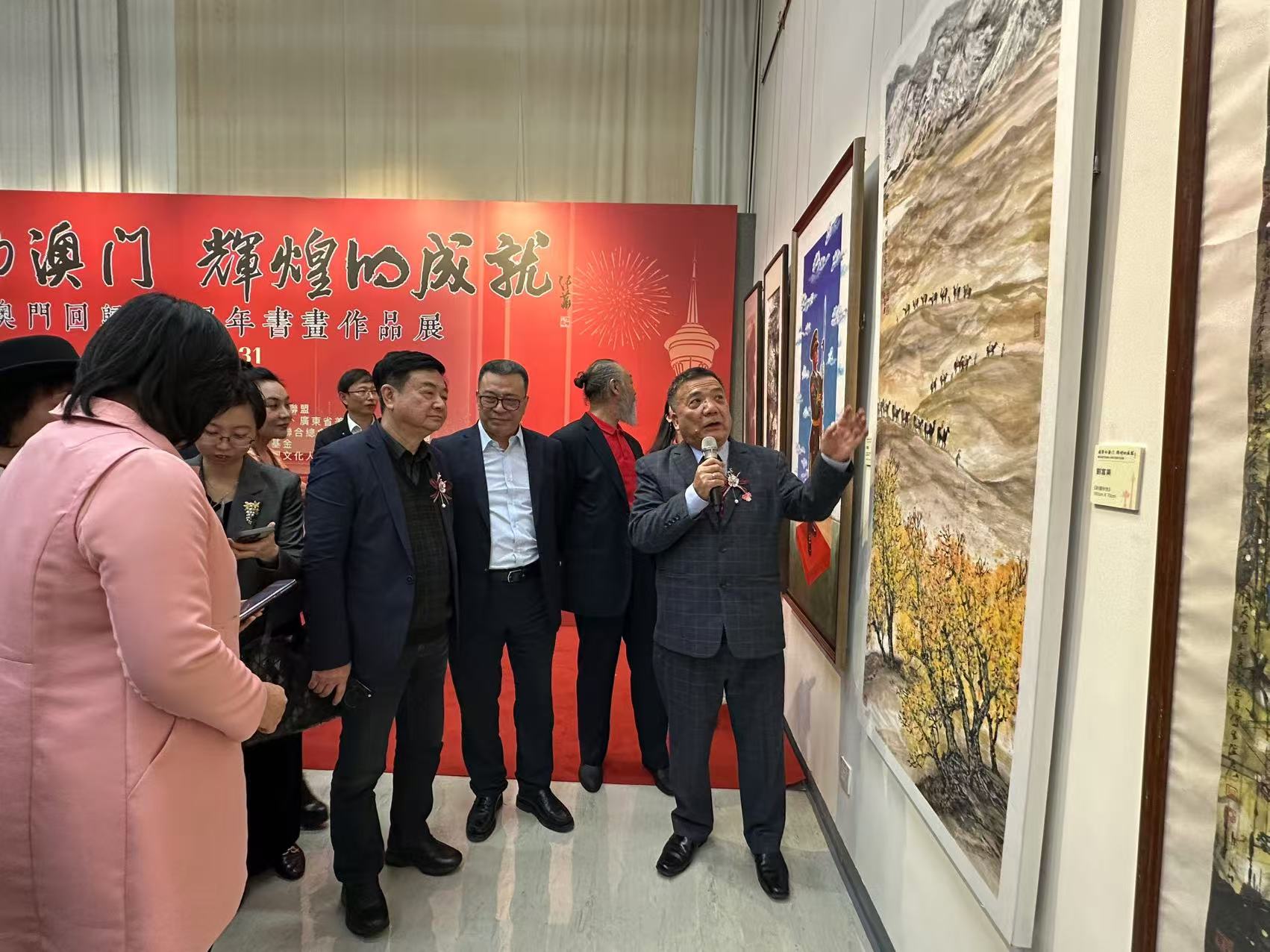 展覽開幕儀式傍晚6時半舉行,行政長官賀一誠,中聯辦宣傳文化部部長萬速成,全國政協常委廖澤雲,澳區全國人大代表黃顯輝,澳門基金會行政委員會主席吳志良,永利澳門有限公司總裁、董事會副主席兼執行董事陳志玲,粵港澳大灣區美術家聯盟主席汪曉曙,廣東省美術家協會副主席、澳門文化界聯合總會美術家專委會主任劉富業等出席主禮。