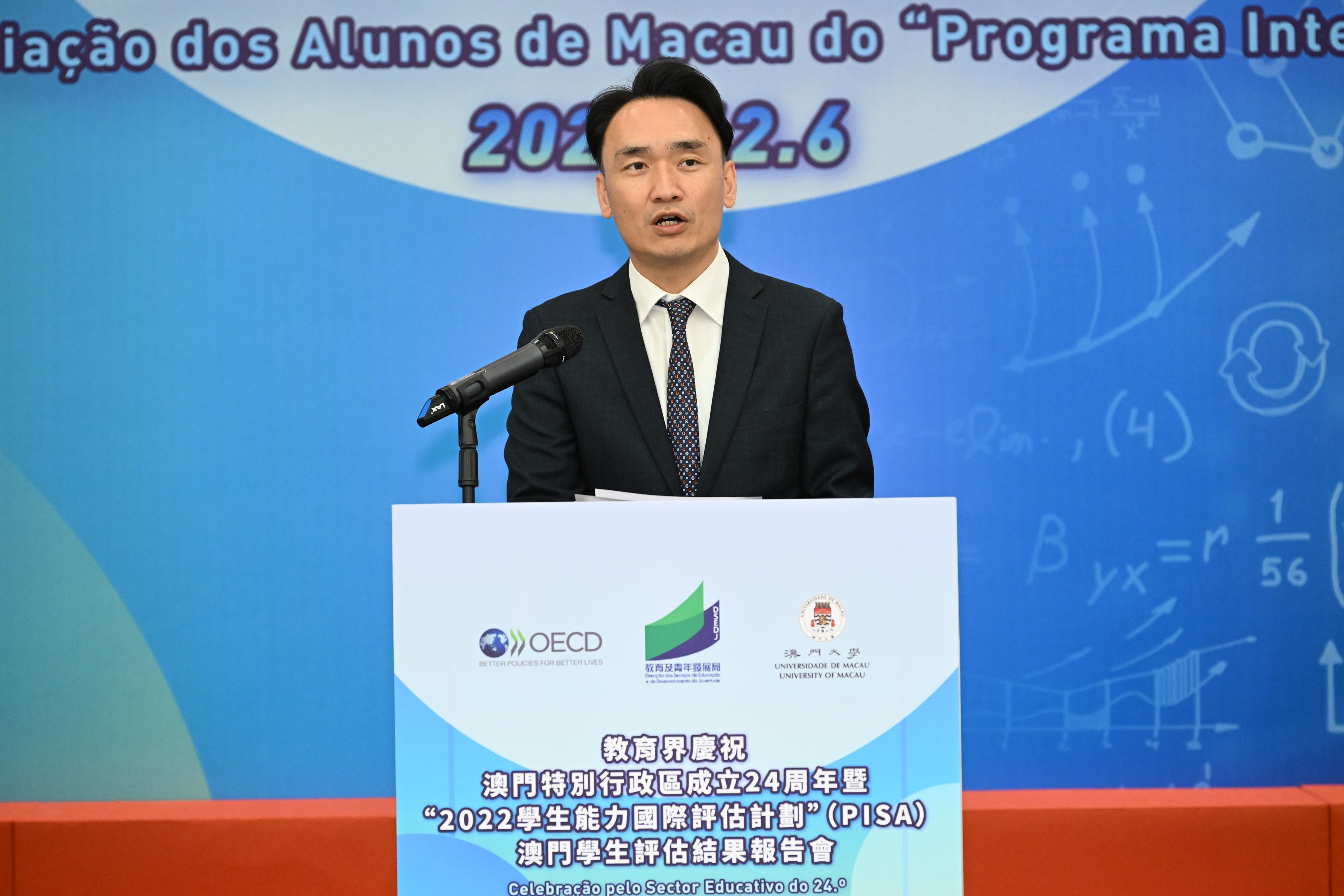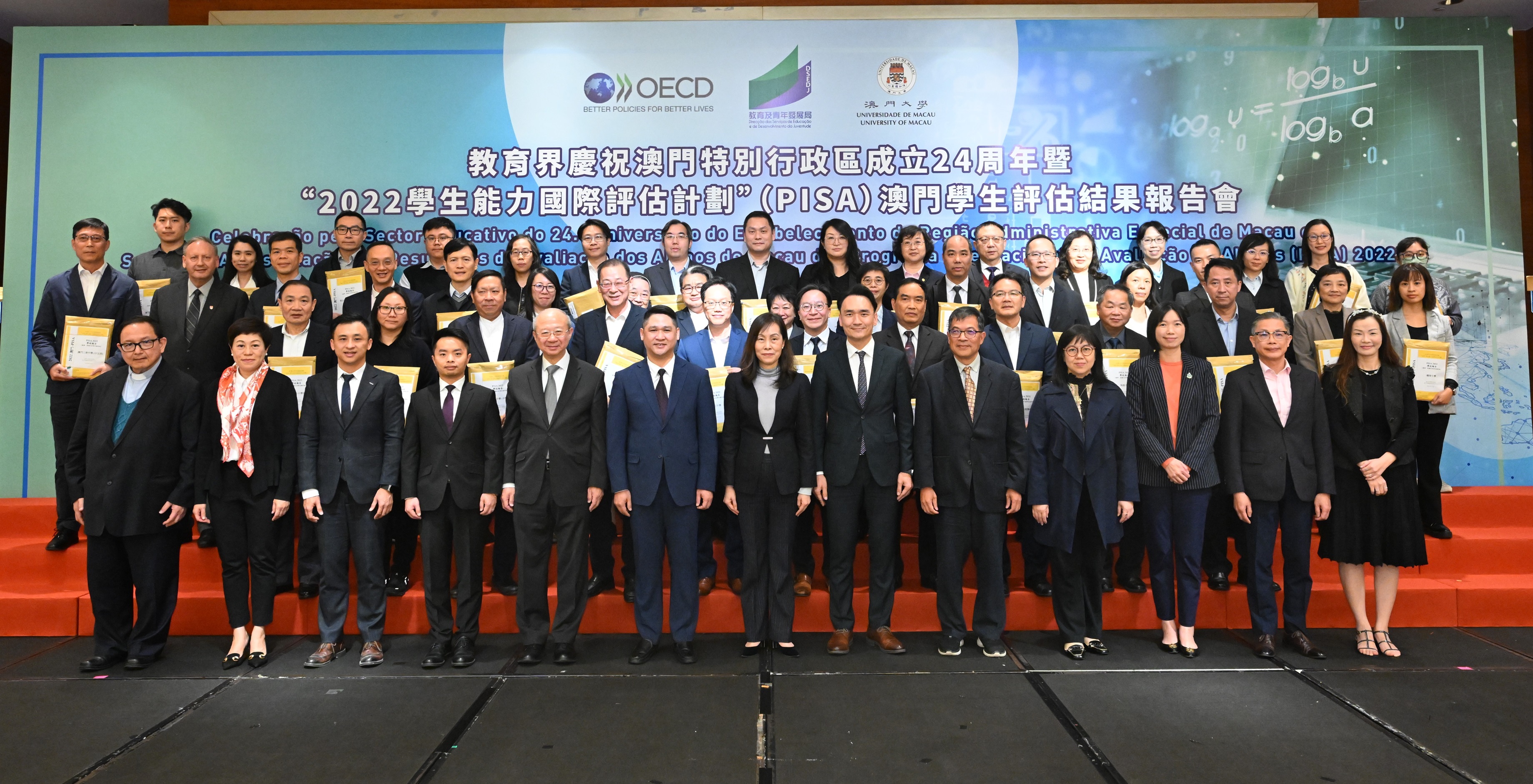 【即時新聞】為了讓教育界持份者及時了解“2022學生能力國際評估計劃”(PISA)澳門學生評估結果、正確解讀研究數據,且適逢澳門特別行政區成立24周年,為讓教育界共同慶祝並加強交流,教育及青年發展局於12月6日舉行 ‘教育界慶祝澳門特別行政區成立24周年暨“2022學生能力國際評估計劃”(PISA)澳門學生評估結果報告會’。社會文化司歐陽瑜司長、中央人民政府駐澳門特別行政區聯絡辦公室教育與青年工作部石書正副部長、中國澳門PISA指導委員會成員(PGB)、教育及青年發展局龔志明局長、澳門大學代表兼教育學院代院長許敬文副校長、中國澳門PISA研究計劃經理(NPM)、澳門大學教育學院教育測驗與評核研究中心主任張國祥教授,以及多位教育委員會委員、學校校長及代表等教育界人士約180人出席。
