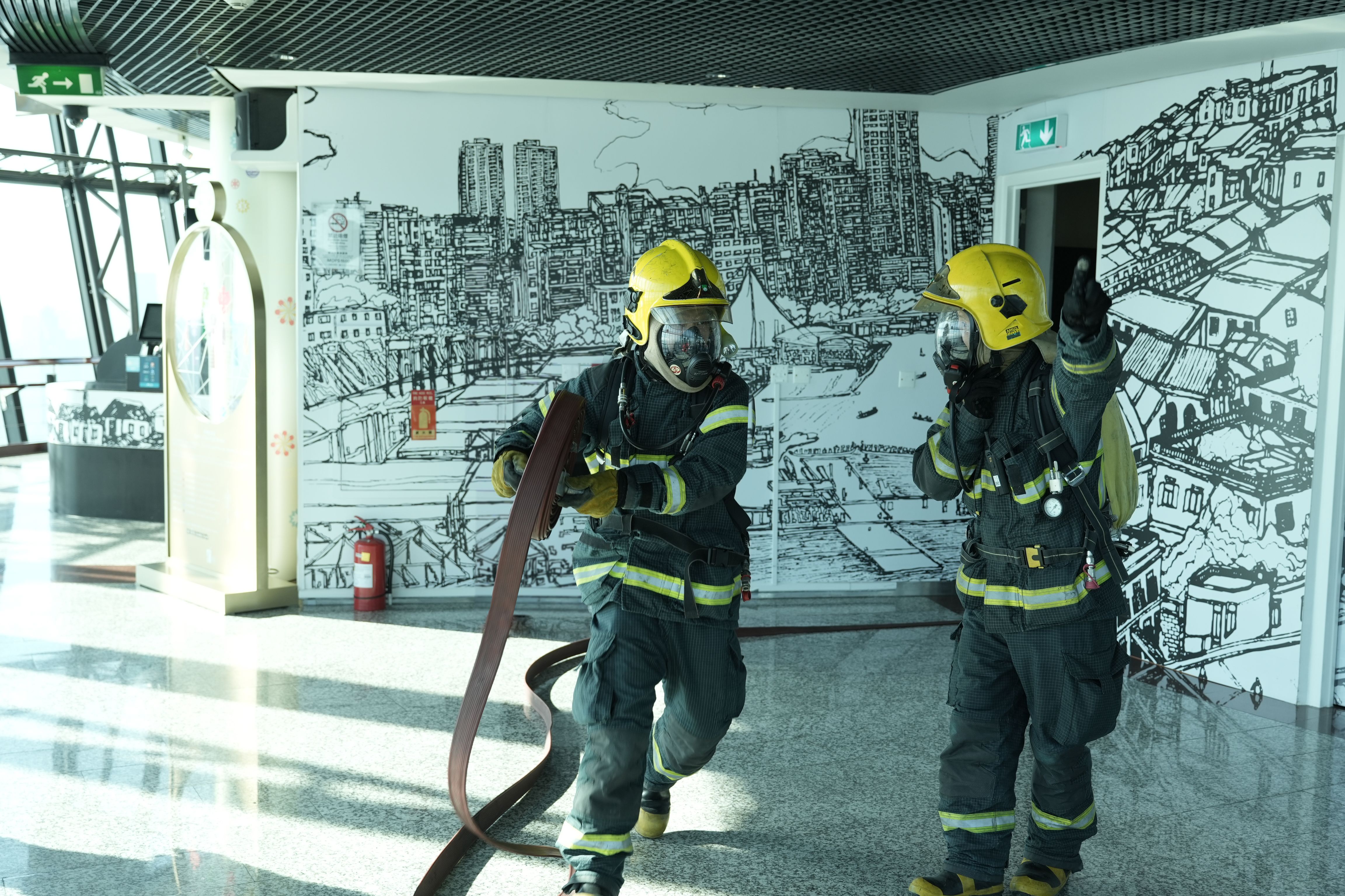 【即時新聞】消防局於今日上午,聯同澳門旅遊塔舉行火警疏散演習,以加強雙方在發生緊急事故時的應變措施及溝通協調機制。