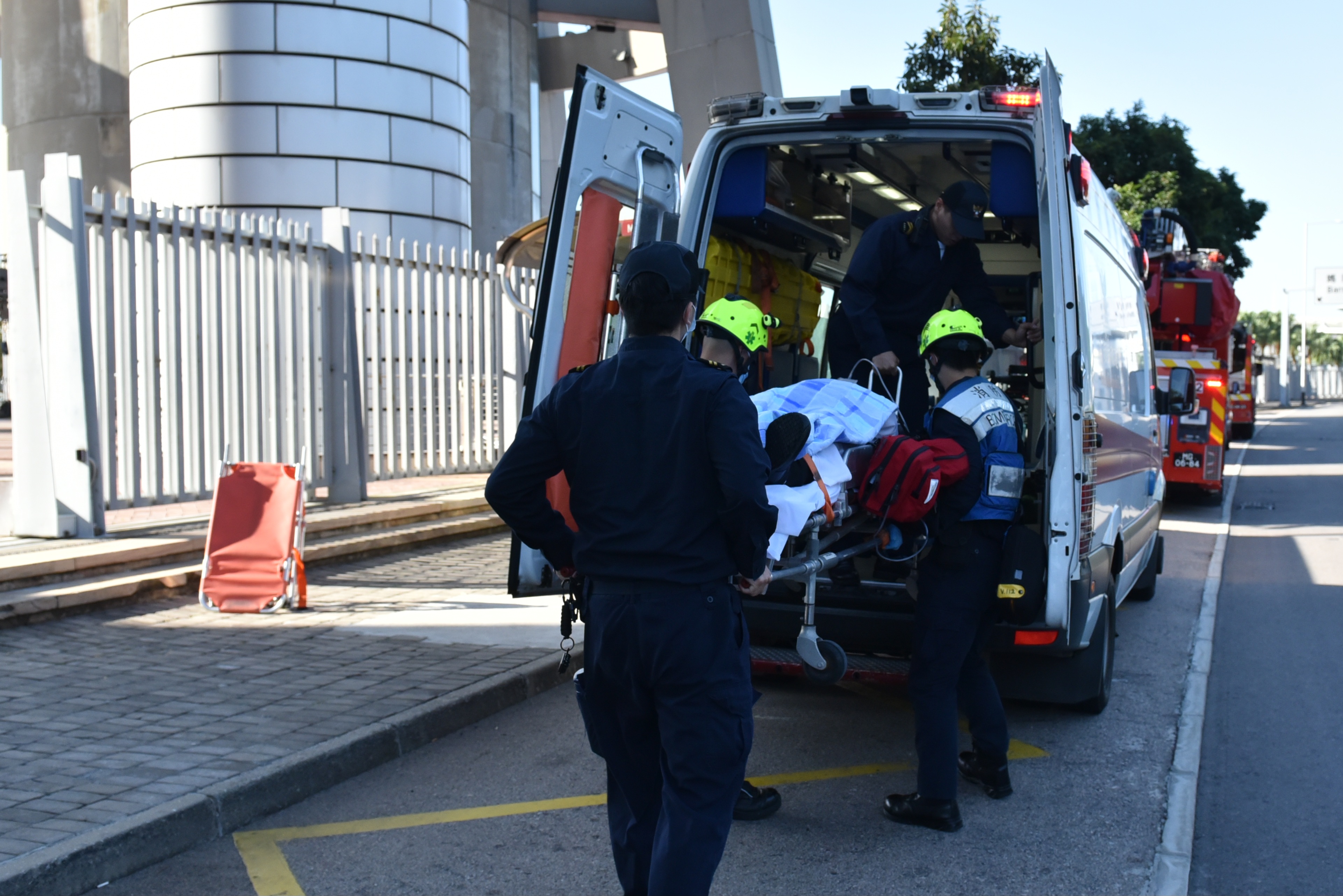 消防局接報後,立即派遣6架緊急車輛及22名隊員趕赴現場,並即時開展滅火及疏散搜救行動,以及將兩名受傷人員模擬送院治理。