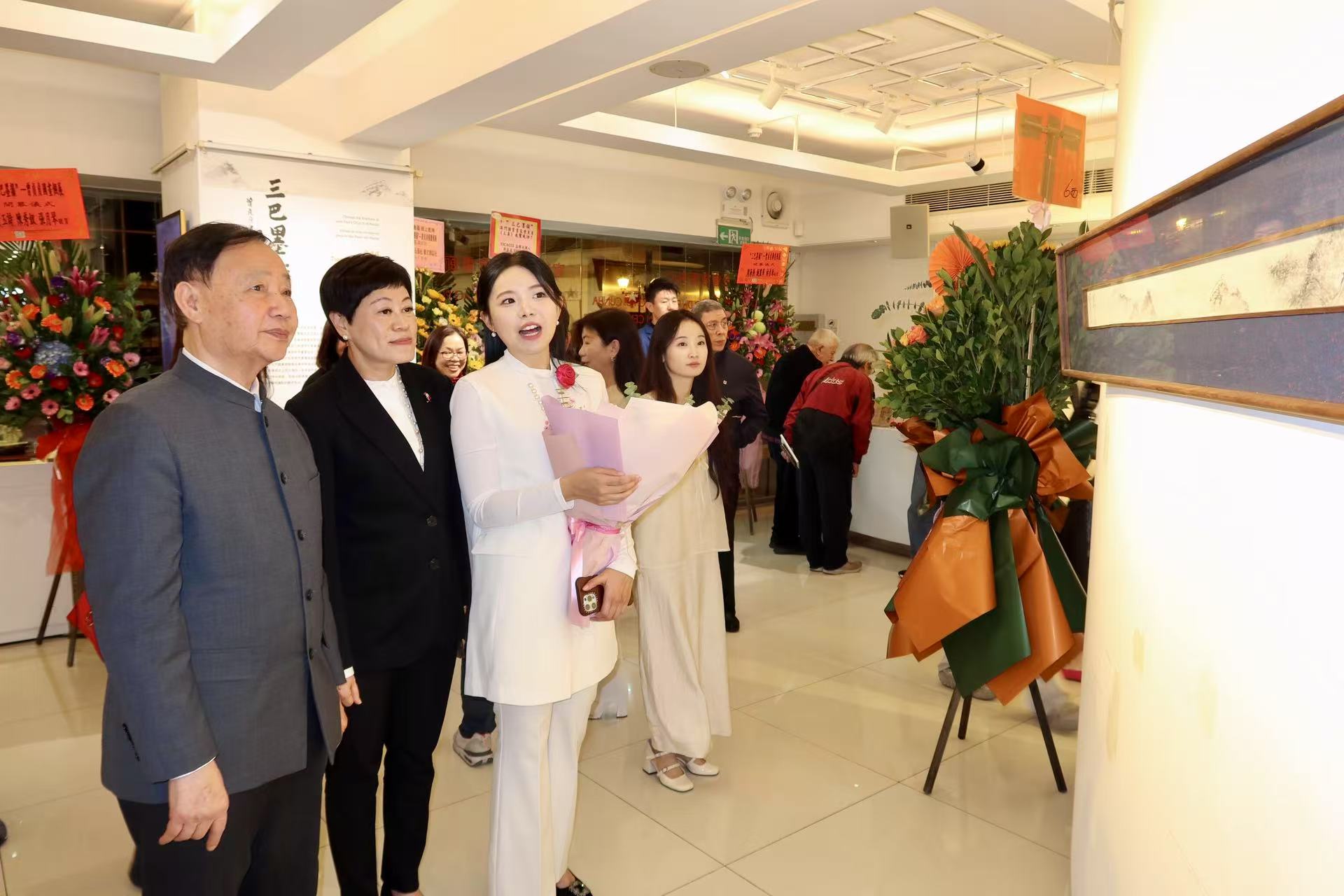 中聯辦宣文部代表成彥希、澳門基金會行政委員會主席代表黃麗莎、東方基金會駐澳門主任柯天玲、婦聯會長劉金玲、青年美術協會會長黎小傑、美術協會副會長曾國明、官樂怡基金會總監馬善才出席,在藝術家曾貞貞陪同下主禮剪綵儀式。