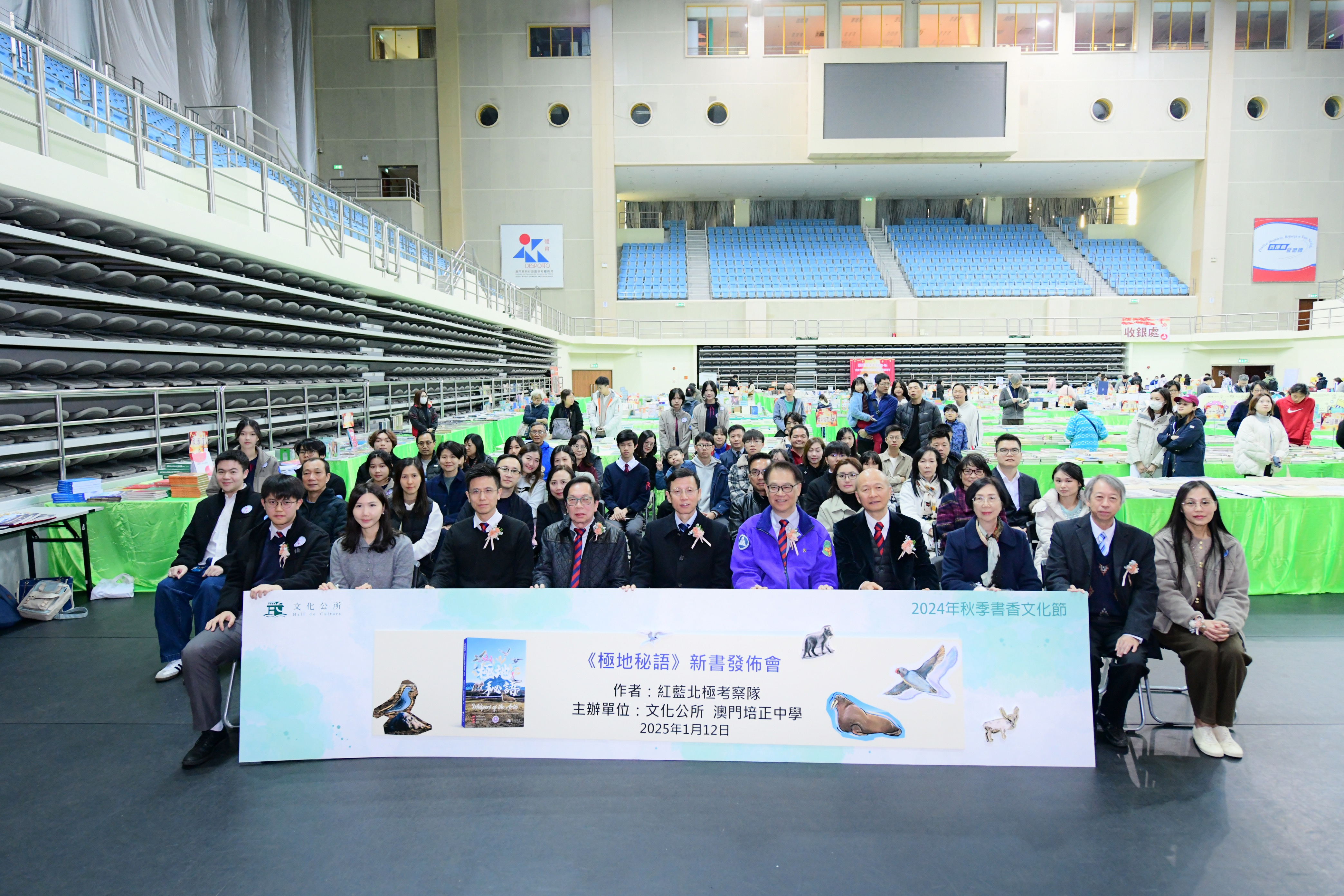 發佈會下午五時在塔石體育館“2024秋季書香文化節”展場舉行,中聯辦宣文部副部長殷汝濤,香港極地研究中心創辦人、澳門培正中學校董何建宗,澳門培正中學學校董、培正同學會主席黃漢堅,紅藍北極考察隊團長、澳門培正中學副校長郭敬文,澳門培正中學副校長陳敬濂,澳門筆會湯梅笑會長,澳門圖書館暨資訊管理協會理事長王國強,文化公所總經理趙香玲,新書編委會指導、澳門培正中學老師周慧心,新書主編池峰主禮。