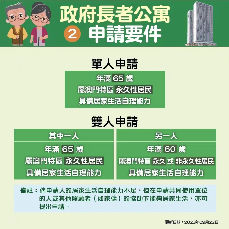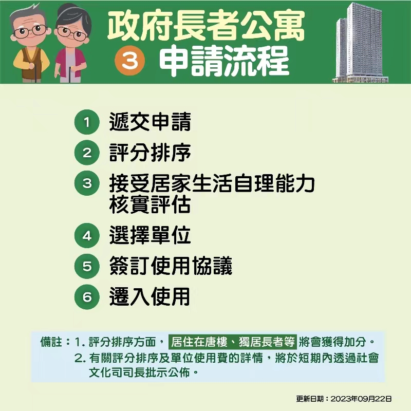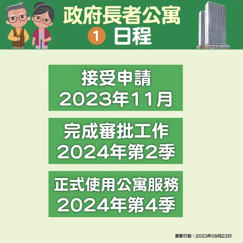 【特訊】《政府長者公寓的使用及管理規章》行政法規將公佈政府長者公寓的申請要件、程序、評分等具體內容。社會工作局預期於11月內可開始接受政府長者公寓的申請、2024年第二季完成公寓申請的審批工作、第三季完成公寓內部裝修和各項設置、第四季可安排合資格的長者使用公寓。