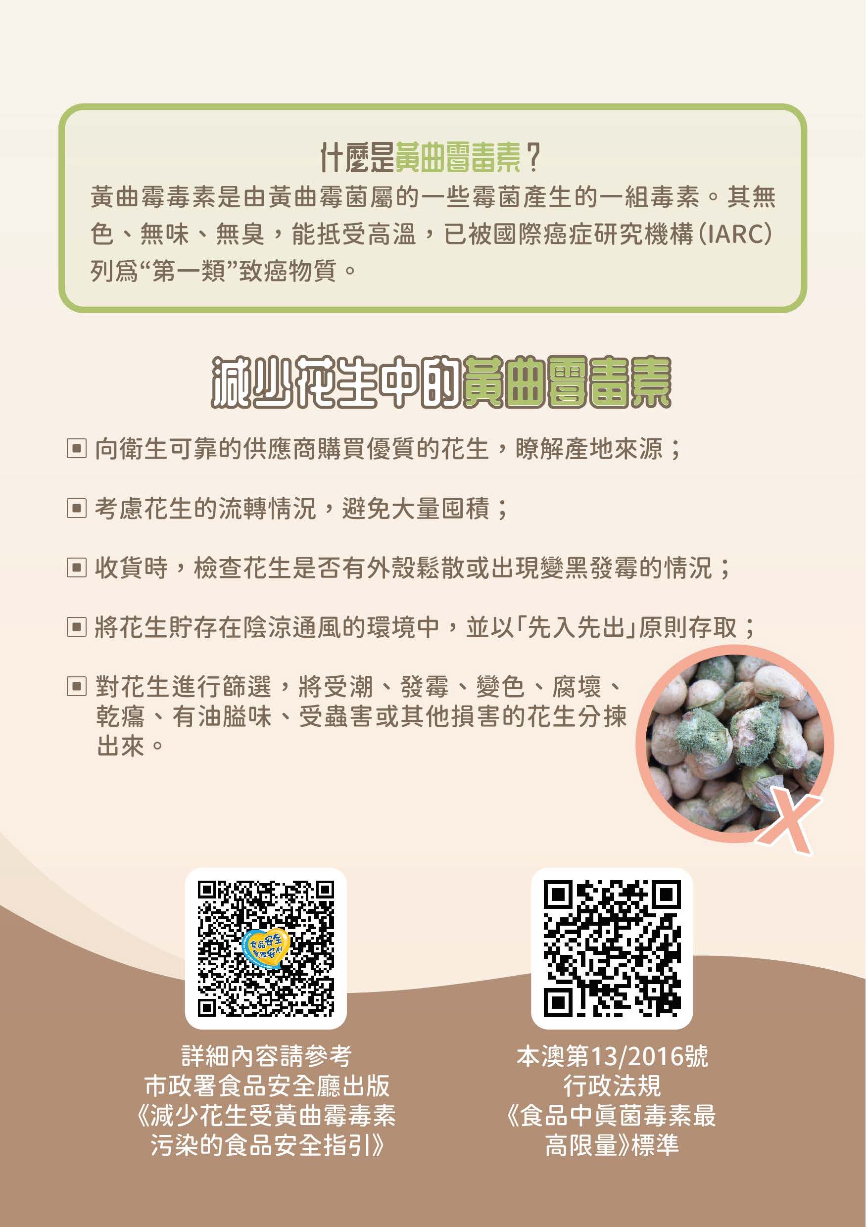 食品安全是澳門發展“創意城市美食之都”的基石,市政署除恆常於市售層面抽取各類食品樣本進行化驗外,亦會根據產品特點及風險因素進行專項調查。市政署於今年推出《減少花生受黃曲霉毒素污染的食品安全指引》(GL 002 DSA 2023),指導業界做好採購、貯存、篩選等環節,輔助業界提升食品安全及質量,以減少食品受黃曲霉毒素污染的風險,確保產品符合本澳《食品安全法》及《食品中真菌毒素最高限量》的規定。