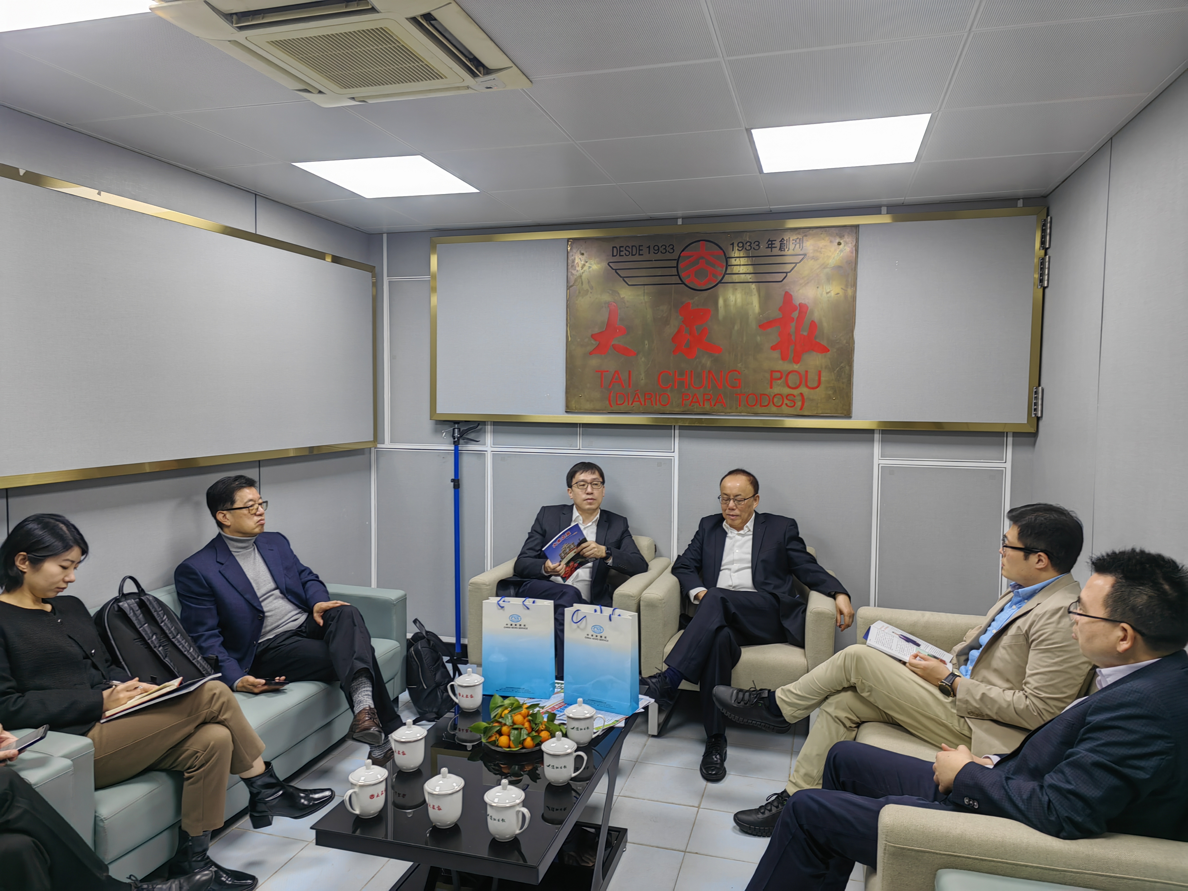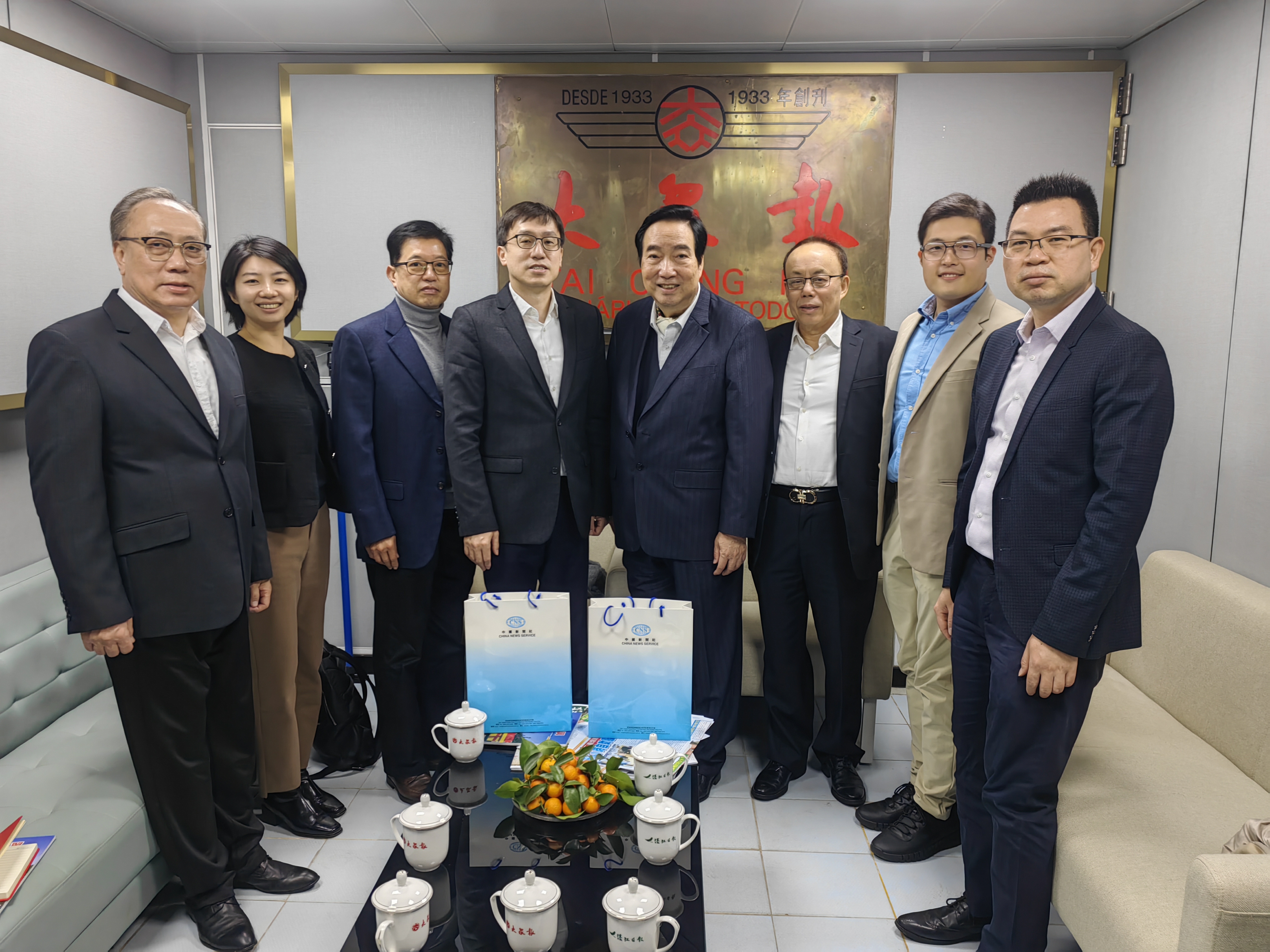 【即時新聞】中新社香港分社總編輯曾嘉,香港分社市場部經理李遠毅、副經理殷銘以及澳門分社首席記者鄭嘉偉等一行下午到訪本報,並參觀了本報的辦公場所,受到大衆報董事會主席、濠江日報及大衆之翼社長黃宇光,大衆報社長胡根,總編輯譚啟鴻,總經理李均榮等熱情接待,雙方座談暢敘友情,還就傳媒業發展、新媒體轉型、以及新聞資訊服務與合作等話題交流,冀日後加強溝通和合作。