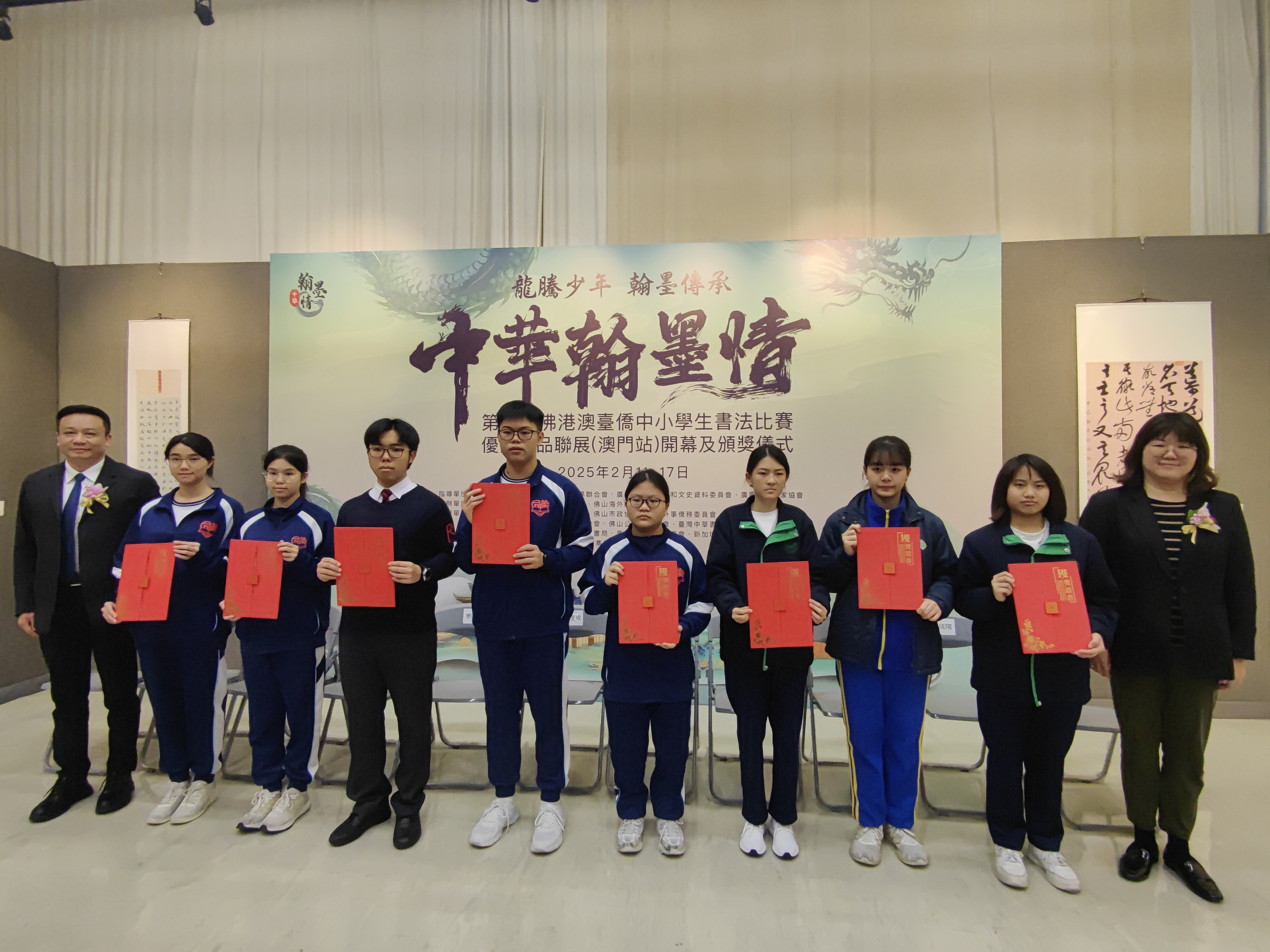 活動同場舉行頒獎儀式,嘉賓向獲獎澳門學生頒發獎項,包括中小學組優等獎各10名、中小學組特優獎各5名,另外小學組和中學組佳作獎各20名;獲得特優獎的同學將參加7月底在佛山舉行的四日三夜夏令營活動。儀式結束後,與會嘉賓共同參觀書法作品聯展。今次展覽展出大賽評選的特優獎、優等獎作品近百件,涵蓋了行書、楷書、隸書、篆書等多種書寫形式,書寫內容亦是豐富多樣,包含詩詞、名言警句、人生哲理等,展現了參與學生們對中華優秀傳統文化的滿腔熱愛。