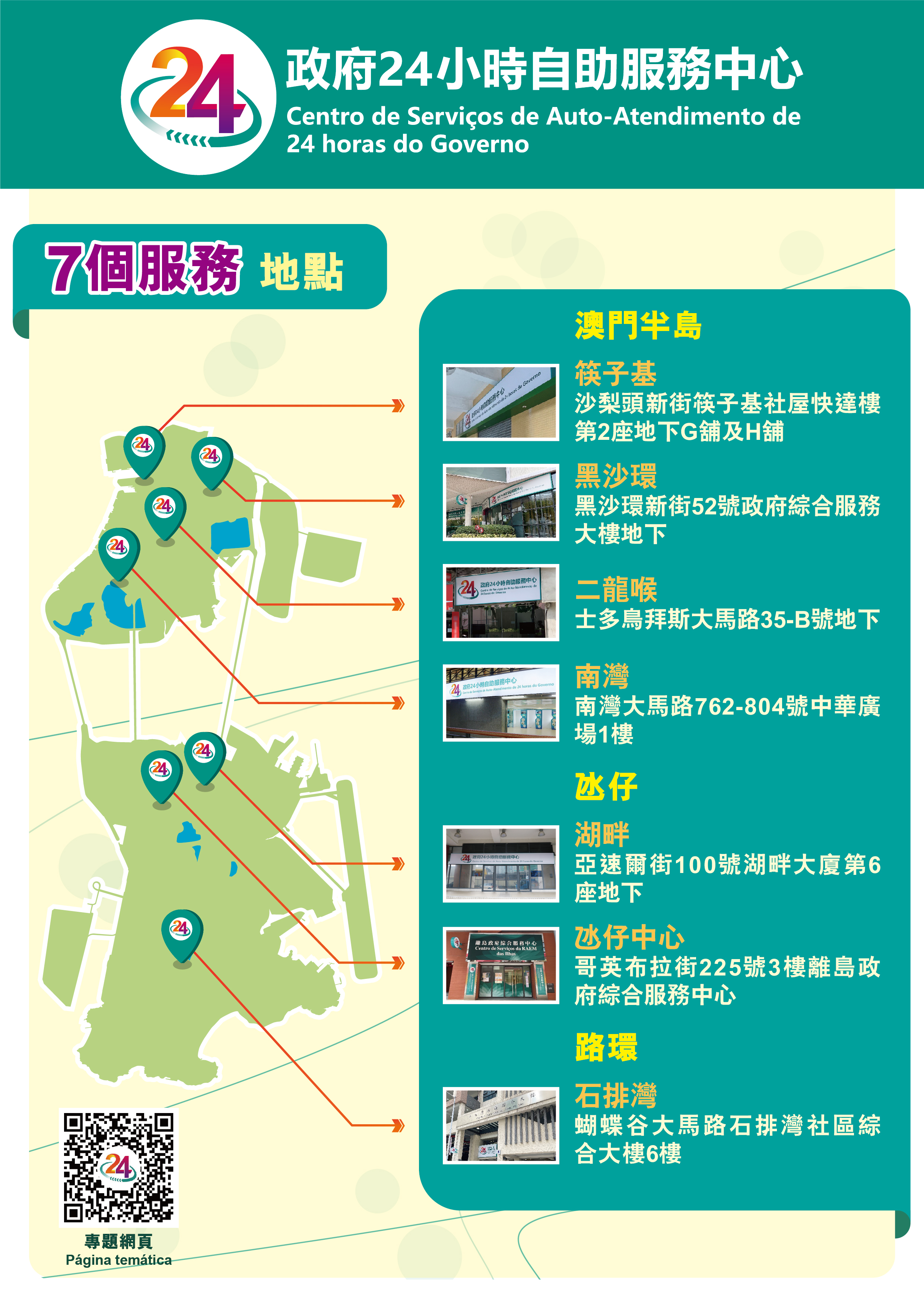 現已投入使用的七個政府24小時自助服務中心分別位於南灣中華廣場、黑沙環政府綜合服務大樓、士多鳥拜斯大馬路(二龍喉公園附近)、筷子基社屋快達樓、離島政府綜合服務中心、氹仔湖畔大廈,以及石排灣社區綜合大樓七個地點,供市民自助辦理多項身份證明文件及自助領證。七個政府24小時自助服務中心自12月5日啟用至今(15日),自助辦證機使用量約3千5百人次,自助領證機使用量約2千5百人次,總服務量達6千人次,平均每日有約6百人次使用,達到預期分流及便利市民的成效。