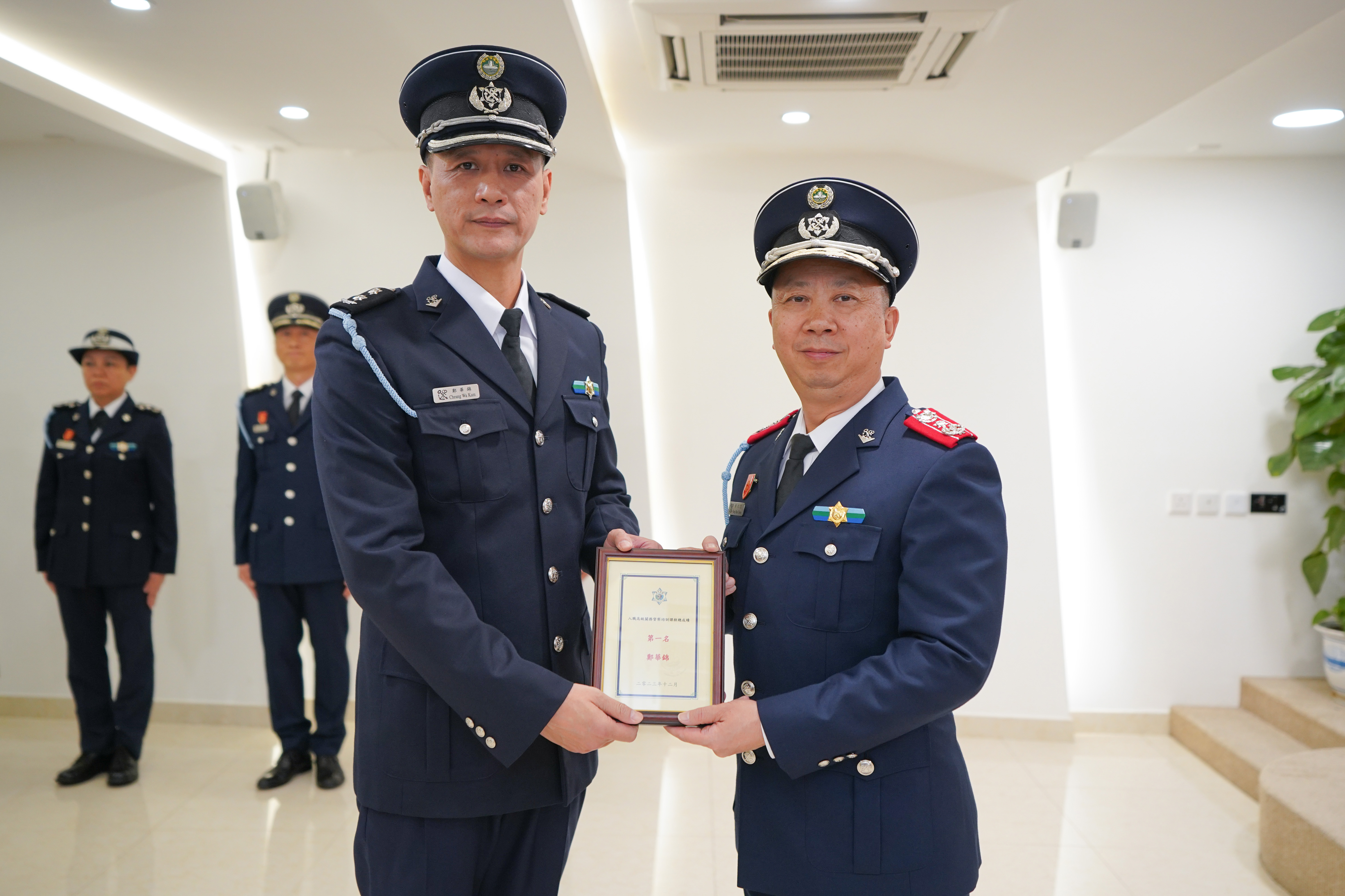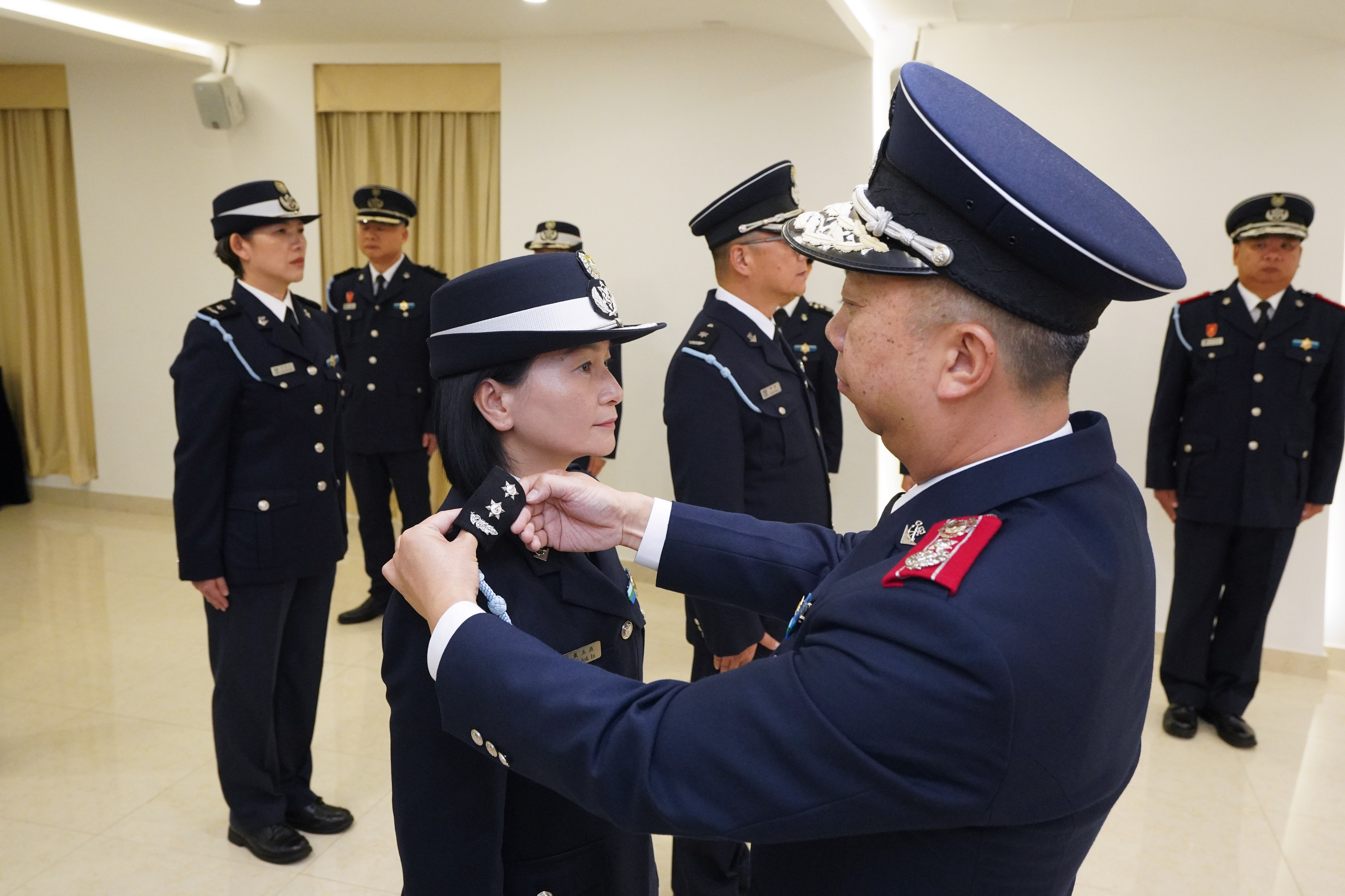 各晉升人員在宣誓後,由海關關長黃文忠為各人佩戴肩章,正式晉升成為高級關務督察,儀式上亦向獲得總成績優異獎的人員鄭華錦頒發獎項。今次是自第13/2021號法律《保安部隊及保安部門人員通則》生效後首批獲晉升的高級關務督察,9名高級關務督察已在海關服務多年,專業知識紮實及工作經驗豐富。