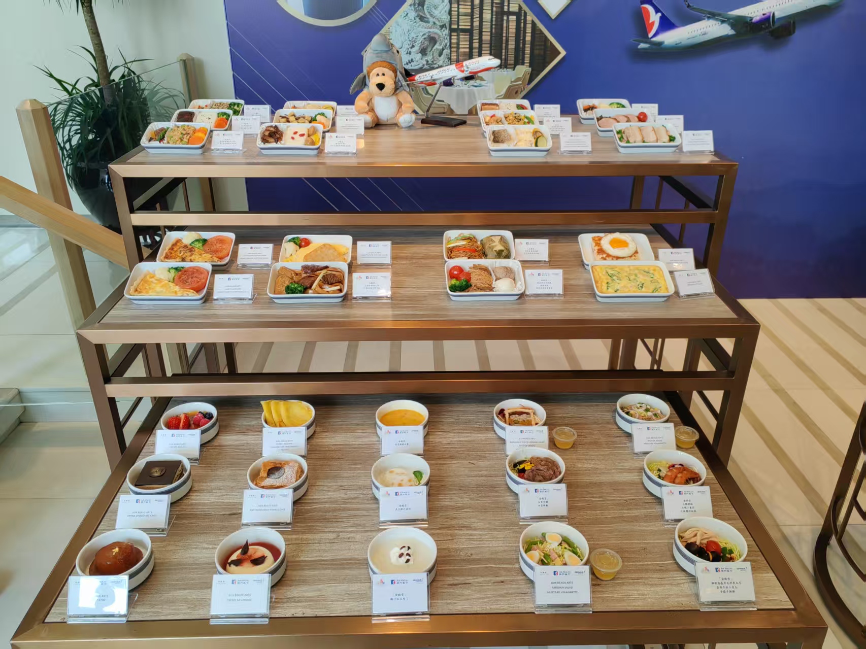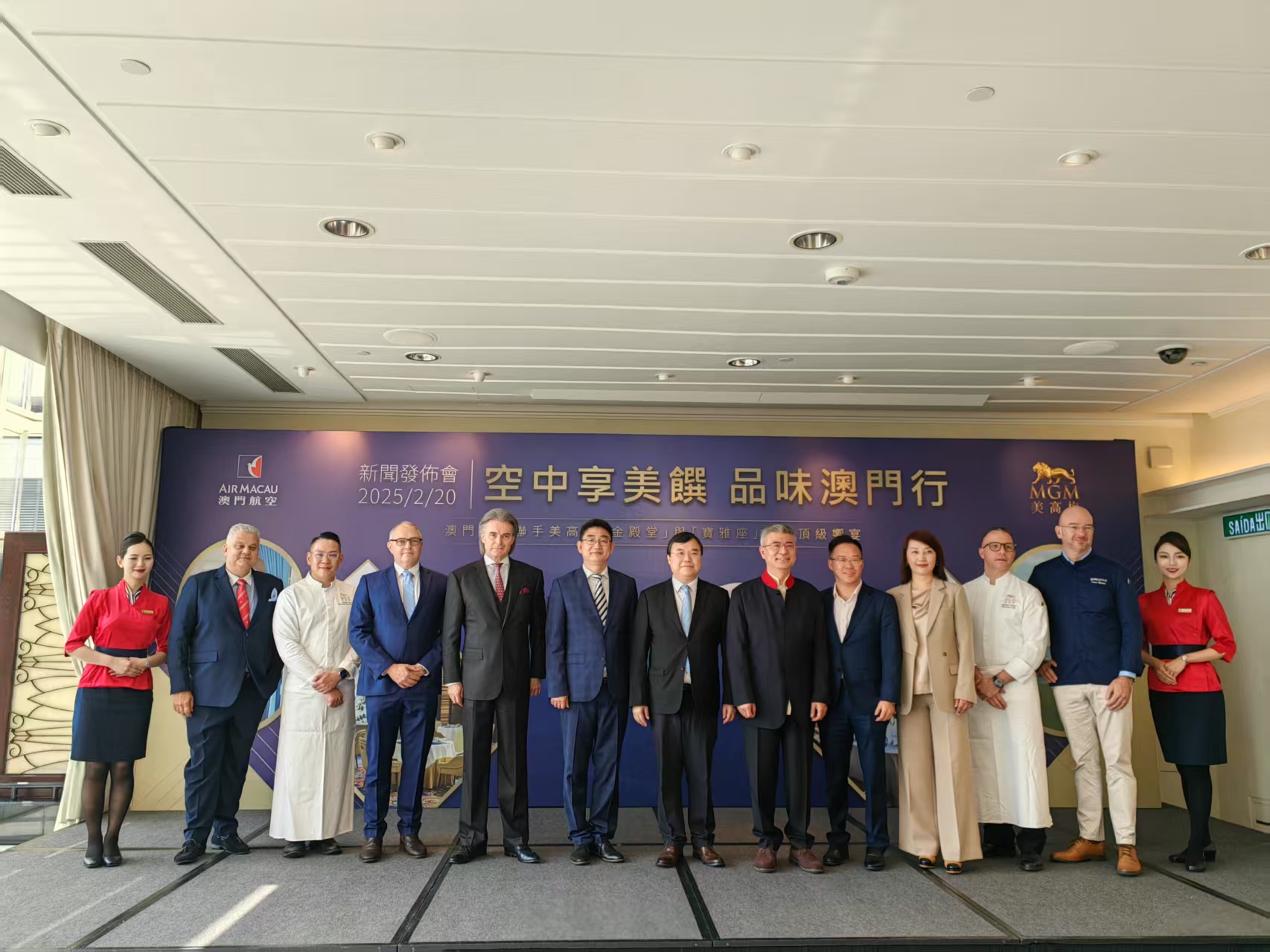 澳門航空是次與嶺南菜食府、黑珍珠一鑽餐廳「金殿堂」以及呈獻經典法式小酒館佳餚的「寶雅座」首度合作,自3月1日起為澳航多條重點航線的商務艙乘客提供嶄新的餐飲選擇。美高梅的專業廚師團隊與澳門航空餐飲服務公司就餐單設計、詳细的配方研究、廚藝交流及培訓等方面用一年時間進行了深入探討,在美高梅專業團隊的技術指導下雙方共同設計出精緻菜式,設有中西式主菜及甜品等多元選擇,供商務艙乘客於早餐、午餐、晚餐及下午茶時段享用,以雲端佳餚呈獻絕妙的味覺享受。