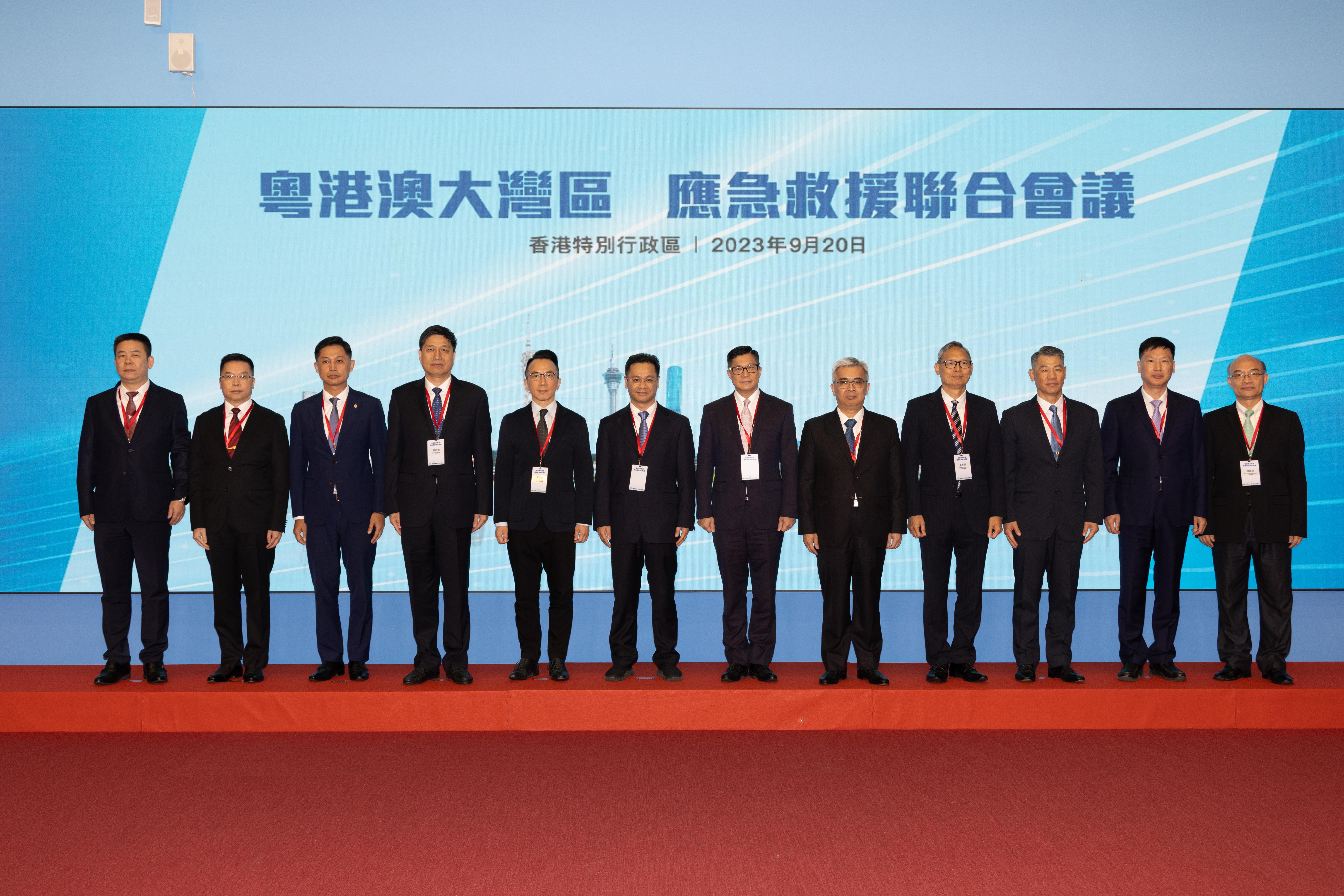 出席會議的粵方代表團成員還包括廣東省應急管理廳副廳長鍾友國、廣東省消防救援總隊總工程師洪聲隆,以及大灣區內地九市應急管理部門及消防救援部門領導;港方代表團成員還有保安局常任秘書長李百全、保安局副局長卓孝業、消防處處長楊恩健,以及警務處、海關、入境事務處及政府飛行服務隊代表;澳方代表團成員還包括警察總局局長梁文昌、消防局局長梁毓森、警察總局局長助理王健,以及澳門海關、治安警察局代表。