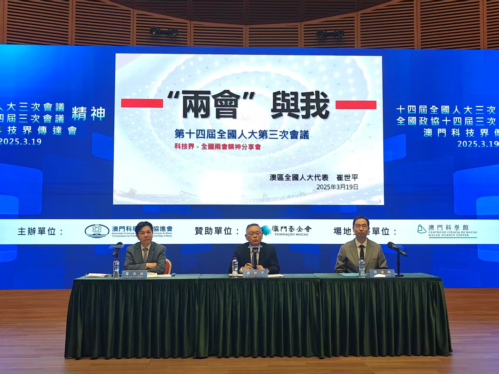 【即時新聞】澳門科協今晚8時30分在澳門科學館會議廳舉辦「全國兩會精神澳門科技界傳達會」,旨在促進澳門科技界深入學習貫徹2025全國兩會精神,準確理解國家重大政策及對澳門未來發展的方略和意義。傳達會邀請全國人大澳區代表崔世平和澳區全國政協委員葉兆佳作分享,澳門科技界社團,高校科研單位代表,科技企業以及金融科技代表近170名出席。