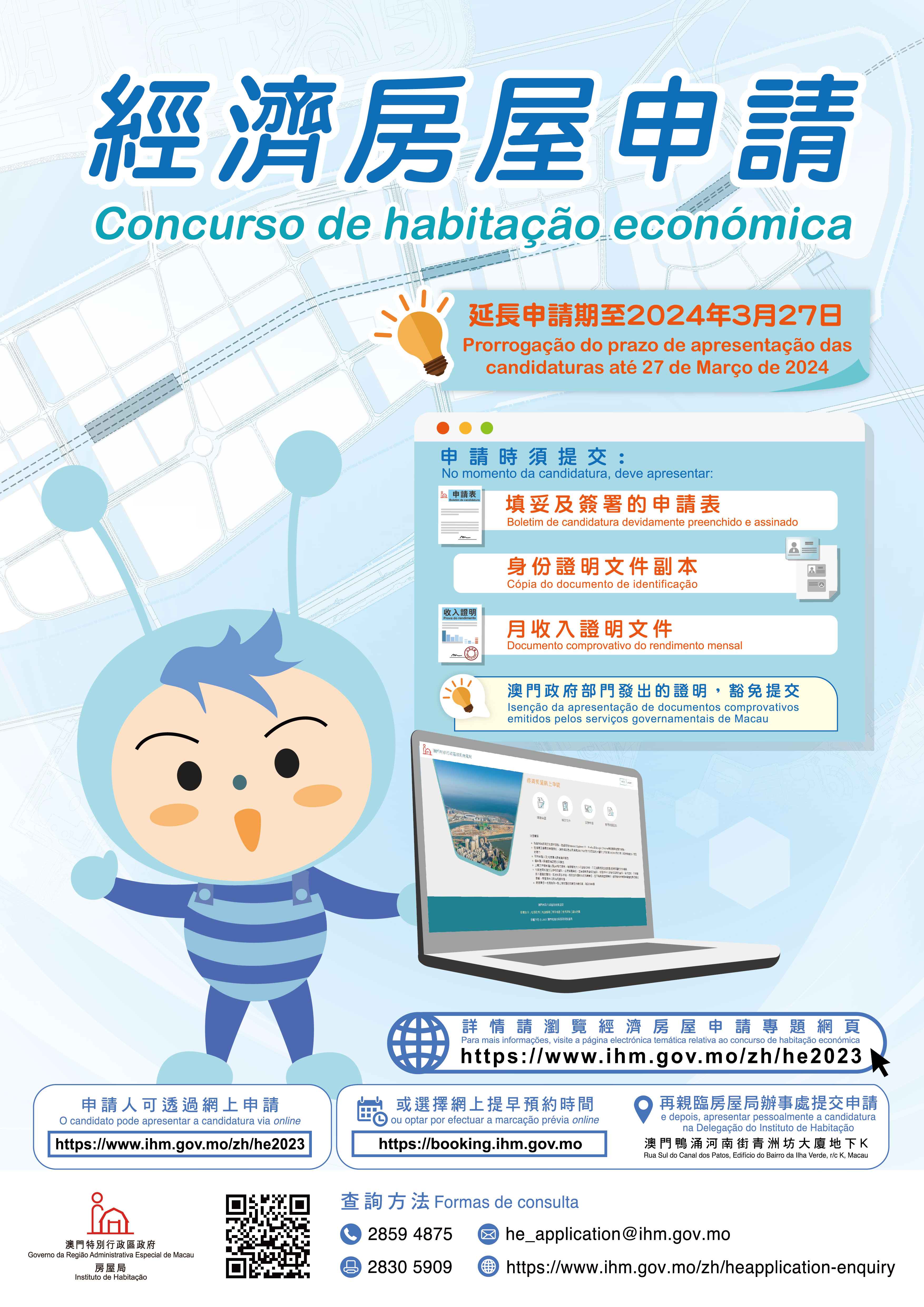 市民可透過電郵([email protected]),或網上(https://www.ihm.gov.mo/zh/heapplication-enquiry),或... 4875向房屋局查詢。房屋局於申請期間在專題網頁內公佈經濟房屋申請情況。