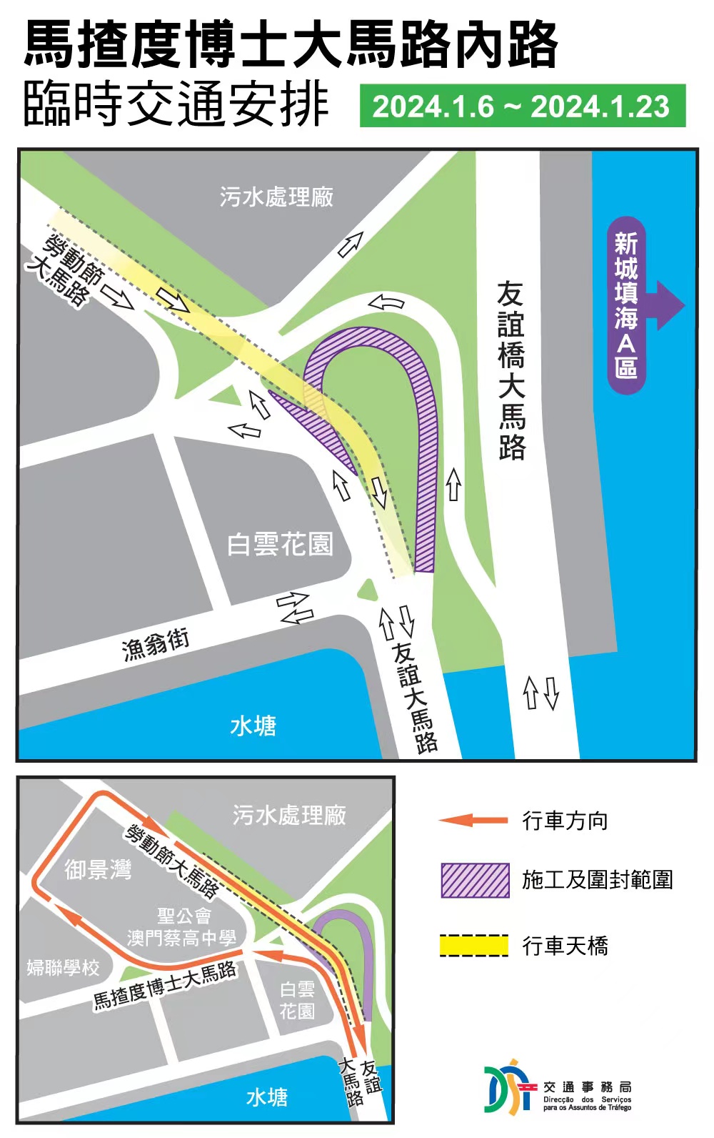 另外,於2024年1月6日至1月23日,配合A2橋工程,馬揸度博士大馬路內路將進行重整工程,屆時馬揸度博士大馬路往友誼大馬路方向之內路將實施封閉交通,車輛可繞經勞動節大馬路行車天橋駛往友誼大馬路,當日上午10時起,1A、3A、10、10B、10X、28B、29及102X巴士路線將會改道行駛,但停靠站點不變。