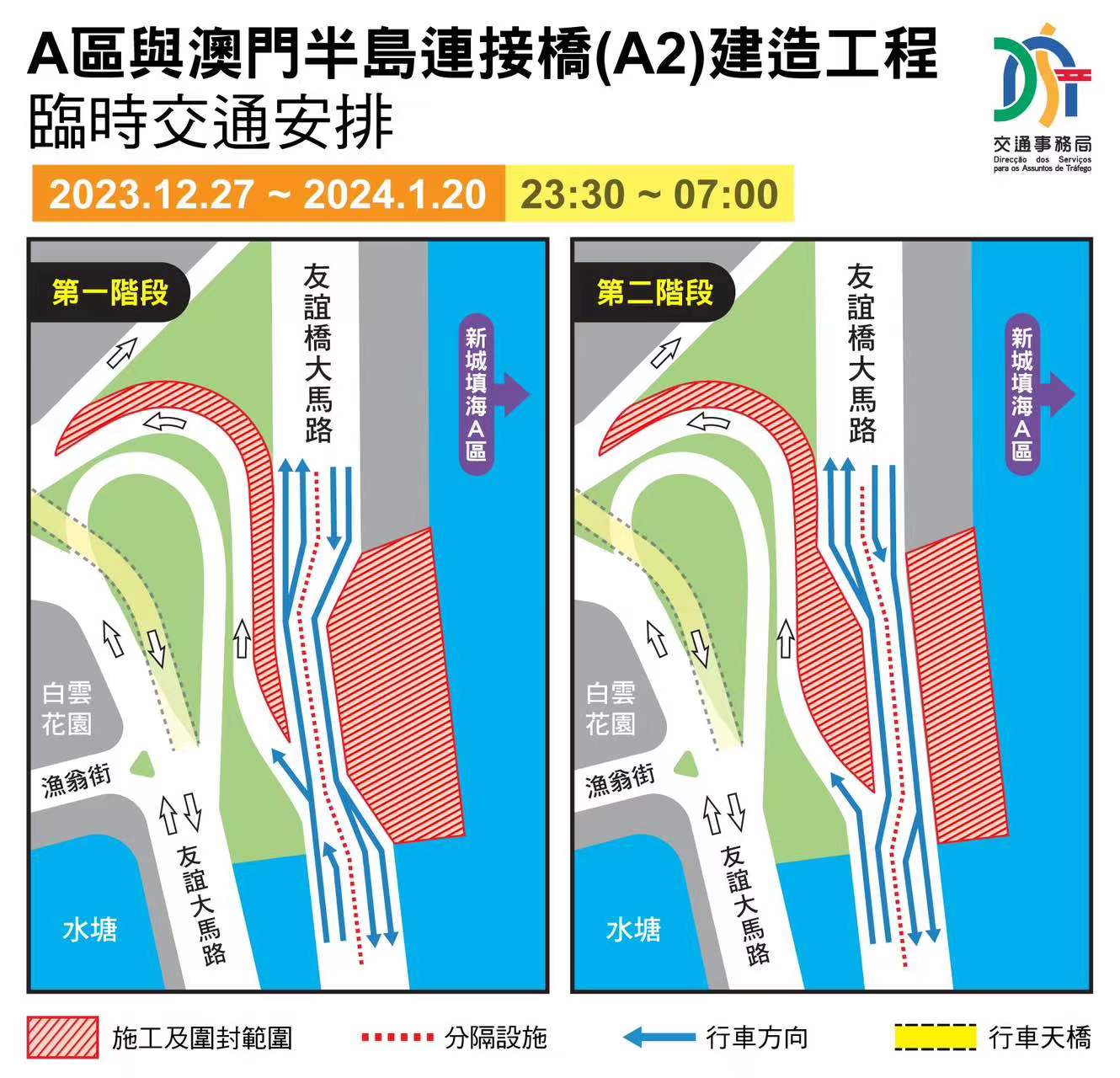 【即時新聞】配合新城填海A區與澳門半島A2連接橋工程推進,需臨時搭建一個橫跨友誼橋大馬路的鋼平台以便進行橋面結構的施工。為減少搭建鋼平台期間對交通的影響,有關工作將安排於夜間進行,因此,12月27日至2024年1月20日,每日晚上11時30分至翌日上午7時,友誼橋大馬路實施有限度通車,屆時往關閘及往友誼大橋方向均保留一條行車線,日間可恢復原來的雙向四線行車。