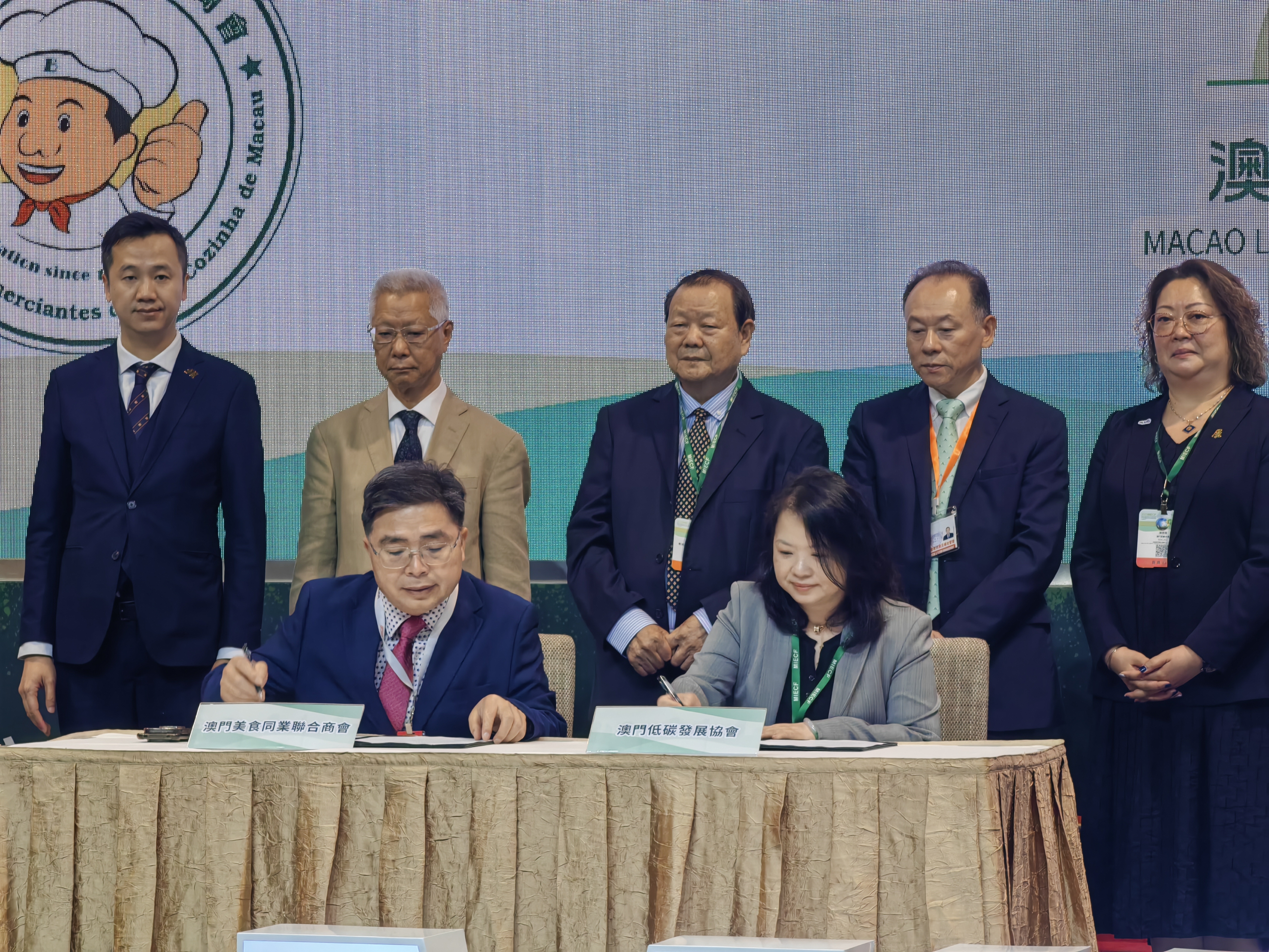 發佈會上,澳門低碳發展協會與澳門美食同業聯合商會簽署《推動美食綠色低碳發展戰略合作意向協議》,共同推動餐飲行業邁向綠色低碳發展。