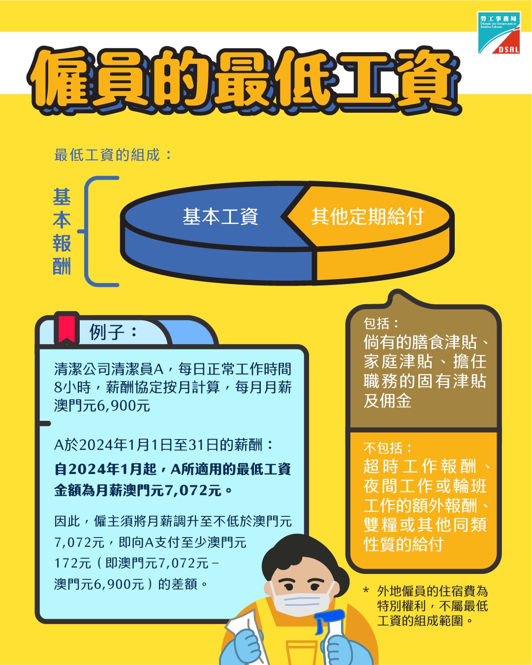 為使社會各界瞭解及遵守有關法律的規定,自法律公佈後,勞工局隨即展開一系列的宣傳工作,包括到訪本澳多個團體及行業協會、為物業管理、清潔及保安行業舉辦專場講解會,及舉辦公開場講解會,以互動討論、案例分享及即場答問等方式,向業界及公眾介紹最低工資金額的調升及須關注的事宜。此外,亦制作了圖文包、海報、法律小錦囊、電視及電台廣告以作宣傳,並派員到商戶進行現場法律宣導工作,藉此加強勞資雙方對自身勞動權益及法定義務的認識,促進和諧穩定的勞動關係。