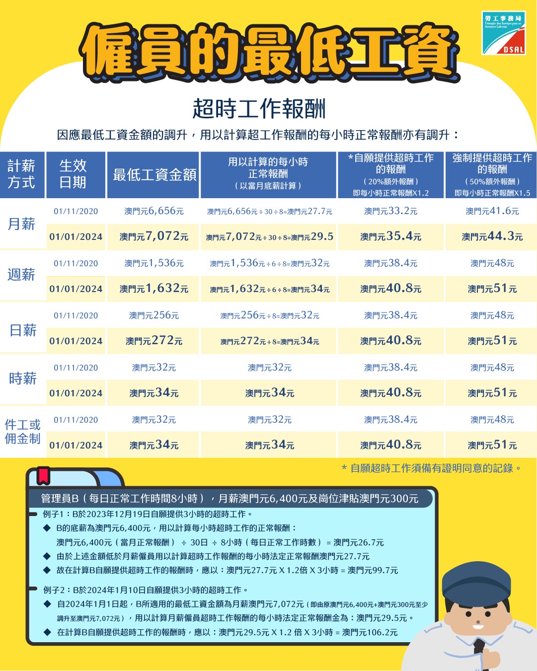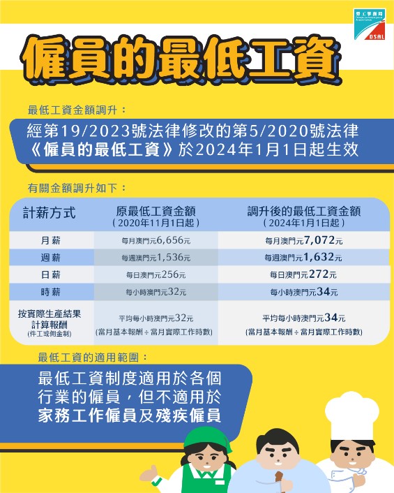 【即時新聞】第5/2020號法律《僱員的最低工資》已於2020年11月1日生效,特區政府須於法律生效後滿兩年進行首次檢討。經綜合考慮澳門宏觀經濟和勞動市場變化、法律實施後對僱員和僱主的影響,以及本澳經濟復甦的表現,並經諮詢社會協調常設委員會勞資雙方代表的意見,在平衡僱主的營商環境、僱員的權益保障,以及消費者的承受能力等因素後,透過第19/2023號法律《修改第5/2020號法律〈僱員的最低工資〉》,將最低工資金額由原來按時計算澳門元32元調升至澳門元34元,升幅為6.3%,並於2024年1月1日生效。