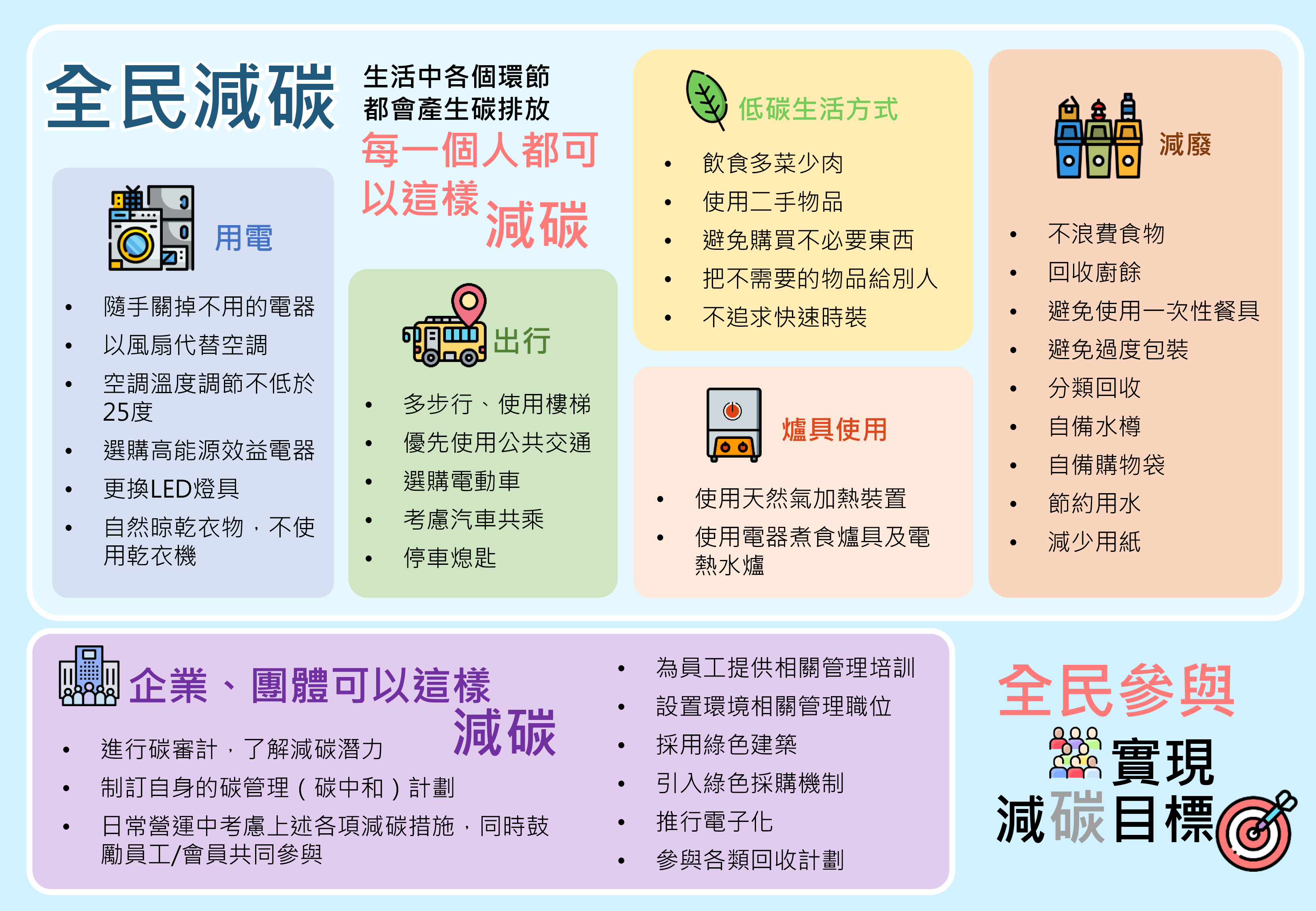 《澳門長期減碳策略》提出“構建低碳電力體系"、“陸上交通綠色轉型"、“節能與清潔能源替代"、“源頭減廢,轉廢為能"、“大眾共同實踐低碳生活"及“技術創新與區域合作"等六個關鍵策略,有序推進各範疇的減碳工作,引領社會大眾共同實踐環保行為。