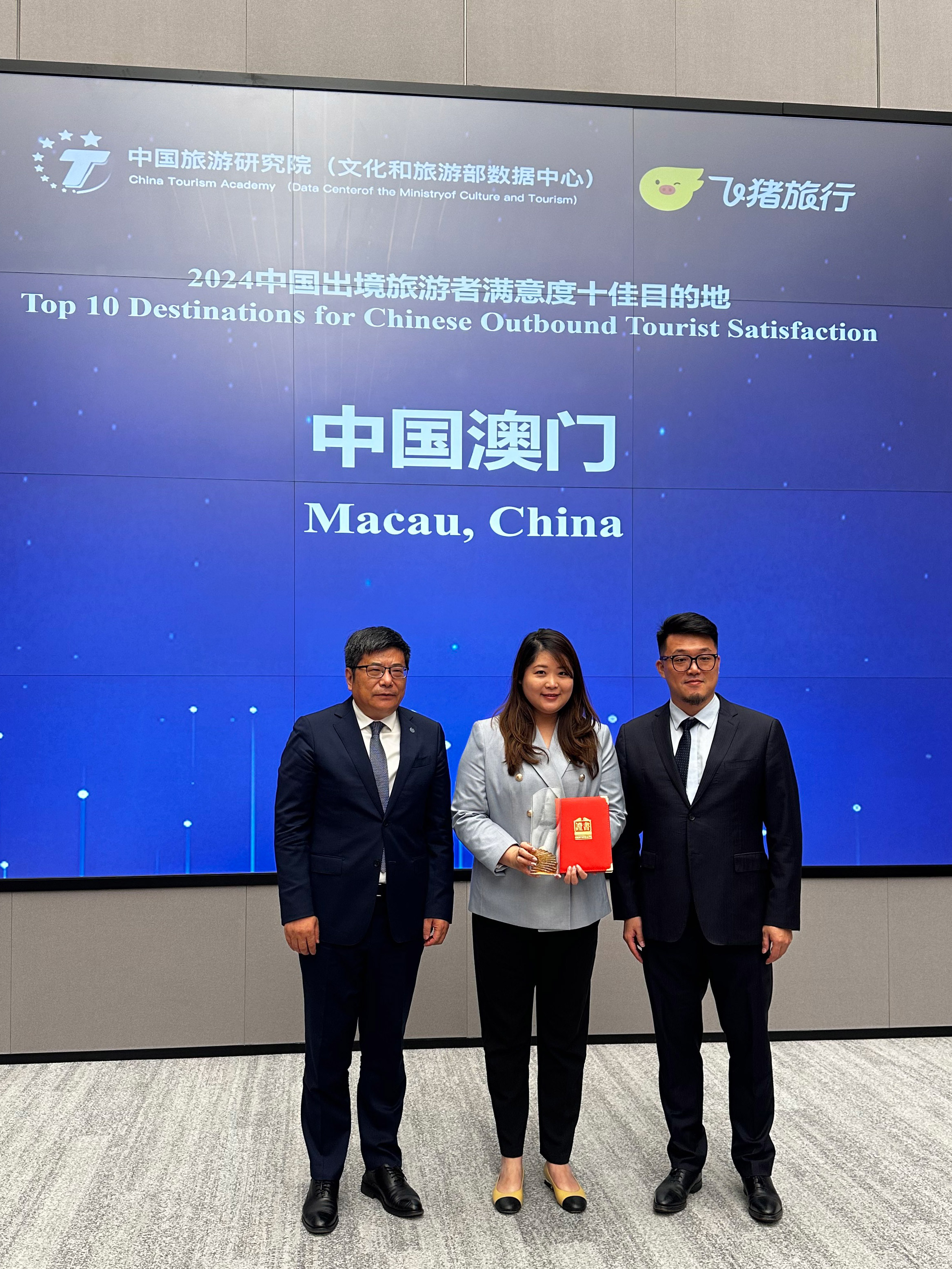 【即時新聞】中國旅遊研究院公佈“2024中國旅遊者出境滿意度十佳目的地”,澳門首奪第一位。旅遊局參與今(26)日在北京舉行的發佈活動,分享推動澳門旅遊業發展的經驗,旅遊局副局長司徒琳麗赴當地出席活動及頒授儀式。