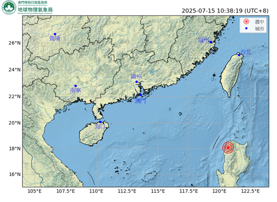 【即時新聞】於本地時間2025-07-15 10:38:19曾發生一次5.5級地震,地點為菲律賓呂宋,震中位於北緯18.10度,東經120.70度,距離澳門東南偏東約871公里,而氣象局亦錄得是次地震。截至2025-07-15 11:30,氣象局收到1名市民報告感覺到是次地震。