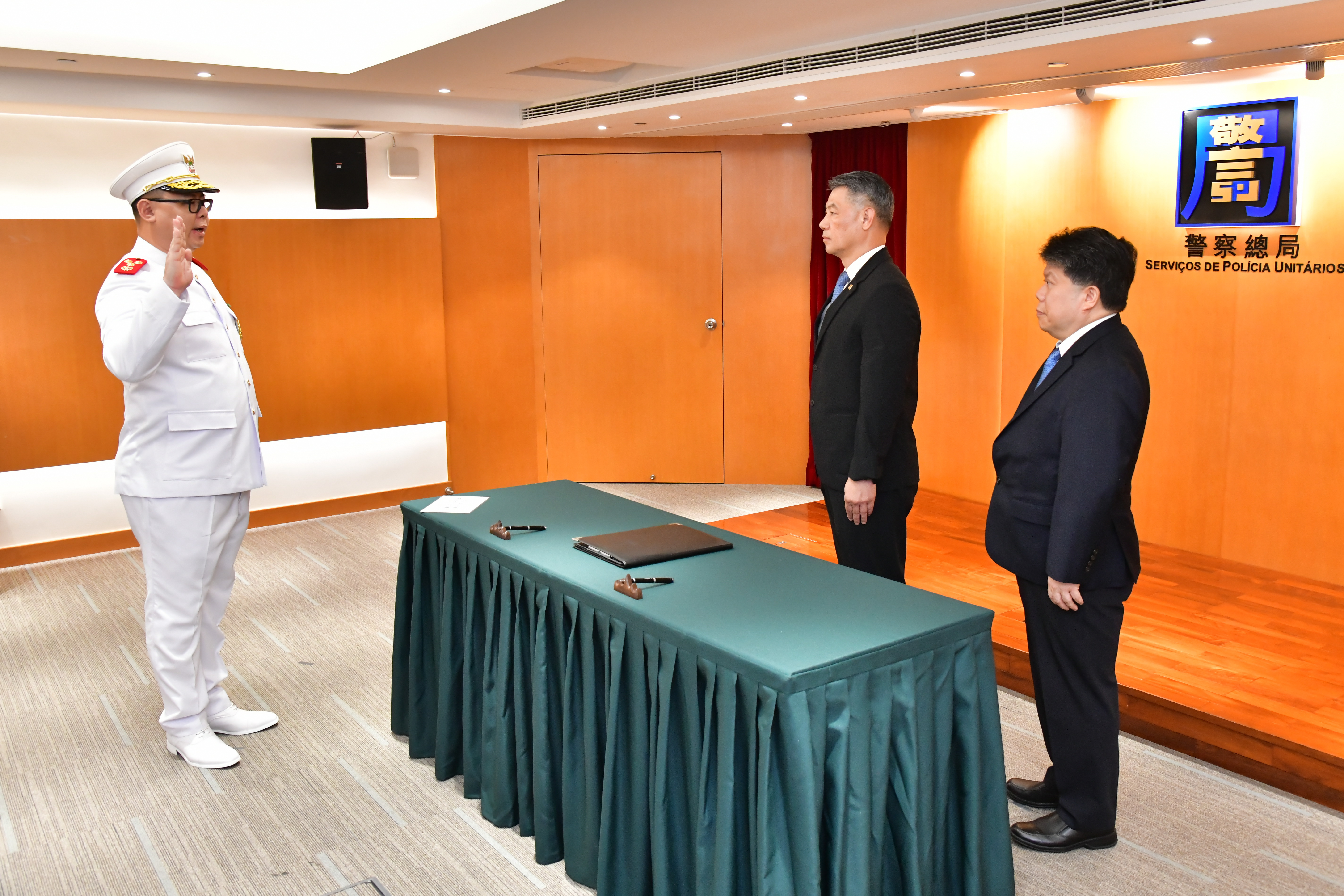 【即時新聞】根據保安司司長批示,自2025年7月16日起,委任治安警察局警務總長魏瑞斌為警察總局局長助理,賦予副警務總監的職能職位,主管情報分析中心;以及委任消防局消防總長林俊生為警察總局局長助理,賦予副消防總監的職能職位,主管民防及協調中心。就職儀式於今(16日)在警察總局舉行,由警察總局局長梁文昌主持儀式,兩位局長助理宣誓就任。出席儀式人員還包括警察總局局長助理梁文照、局長辦公室協調員趙汝民、金融情報辦公室副主任馮婉琪以及各部門主管及同事。