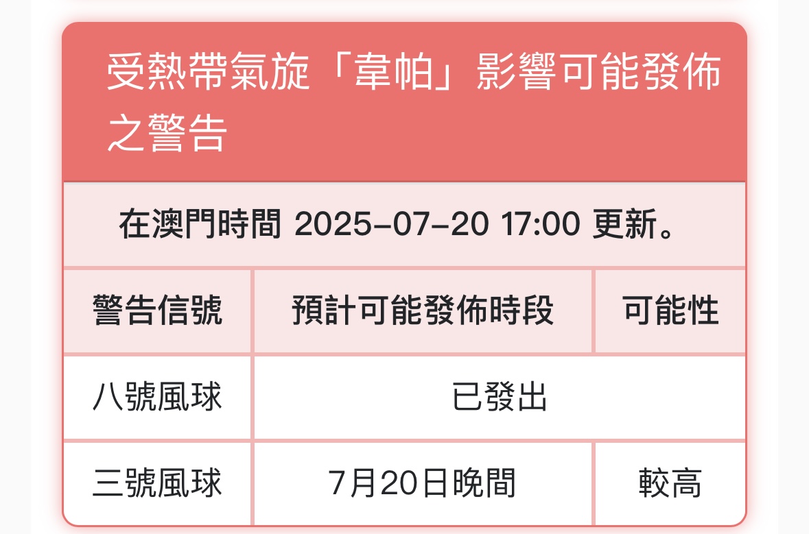 【即時新聞】氣象局已於下午5時改發八號風球及藍色風暴潮警告,隨著颱風「韋帕」逐漸遠離本澳,預料晚間改發三號風球的機會較高。預測下午5時至晚上10時,低窪地區會出現水浸,最高水位不高於0.5米。