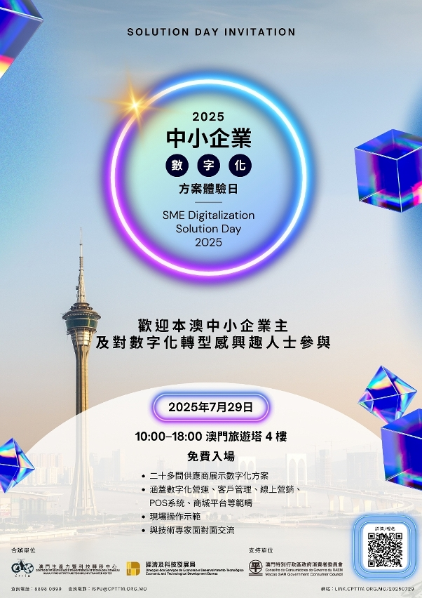 【即時新聞】為鼓勵及支持本澳中小企進行數字化升級,澳門特區政府自2023年起推出“中小企業數字化支援服務”,由經濟及科技發展局主辦,澳門生產力暨科技轉移中心執行。為更好地協助中小企業選擇數字化設備、網絡營銷等數字化工具,經科局與生產力中心將於本月29日假澳門旅遊塔舉辦“中小企業數字化方案體驗日”,歡迎有興趣企業到場。