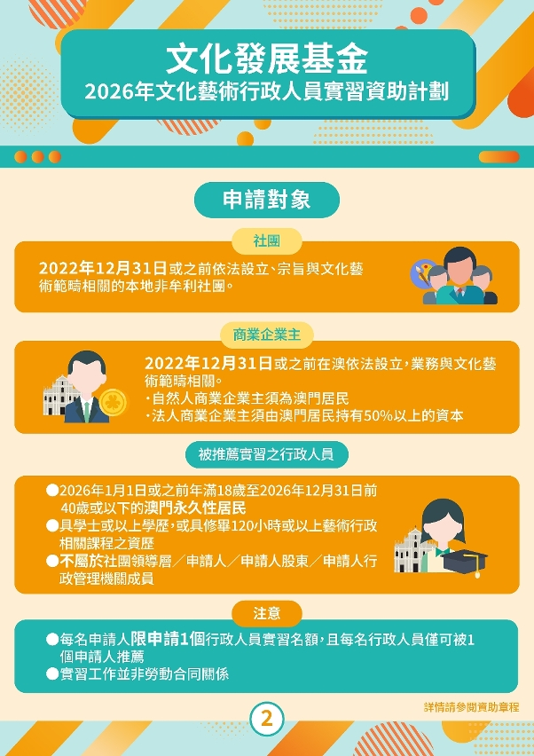 凡於2022年12月31日或之前已在澳門依法設立、屬文化藝術範疇相關的本地非牟利社團,或符合前述條件且由澳門特區居民擁有50%以上資本之商業企業主,可作為申請人推薦1名年滿18歲至40歲或以下、不屬於其單位領導層或股東的澳門永久性居民參與本項實習資助計劃。