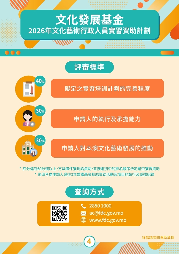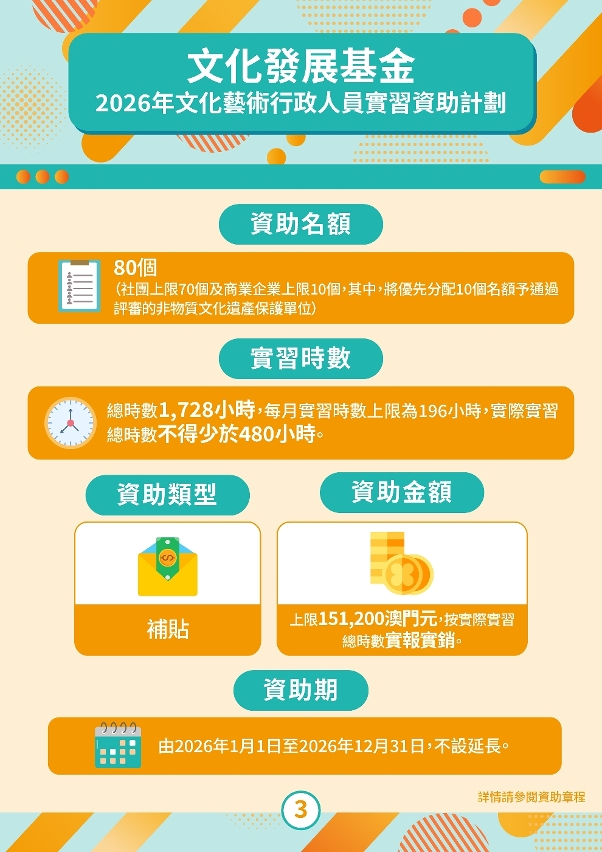 【即時新聞】文化發展基金於8月1日至8月25日接受“文化藝術行政人員實習資助計劃”的申請,鼓勵本澳文化藝術社團或商業企業通過參與此項計劃,提供有關文化藝術活動策劃、統籌、行政及技術等實習機會,為本澳培養文化藝術範疇行政人員,從而促進澳門整體文化藝術的健全發展。