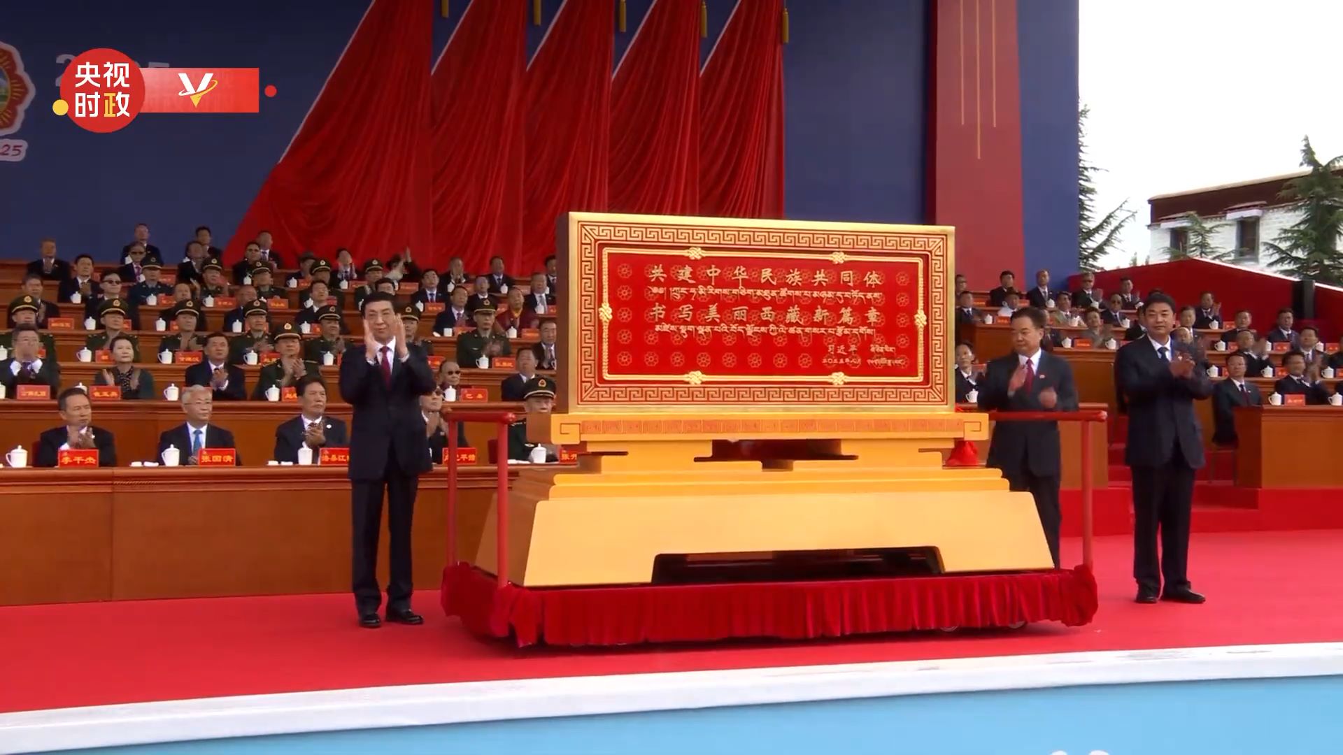 中共中央政治局常委、全國政協主席、中央代表團團長王滬寧向西藏自治區贈送習近平題詞的“共建中華民族共同體,書寫美麗西藏新篇章”賀匾。