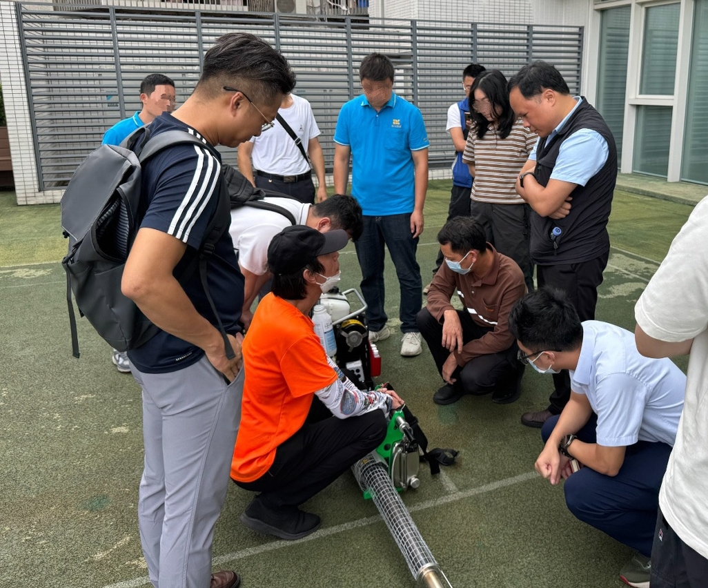 培訓課程分為室內講解與室外實務操作兩部分,內容包括:1、介紹滅蚊機器及藥物的種類與特性,以了解不同設備的功能與適用場景;2、講解操作人員應佩戴的安全防護裝備,確保在使用藥物及機器過程中保障個人安全;3、系統說明滅蚊操作流程及注意事項,以掌握標準作業方法;4、由專業人員現場示範超低容量噴霧機及熱霧機的操作,並安排分組實操,熟悉設備調校、啟動、噴灑及維護技巧,提升整體的實務操作能力。