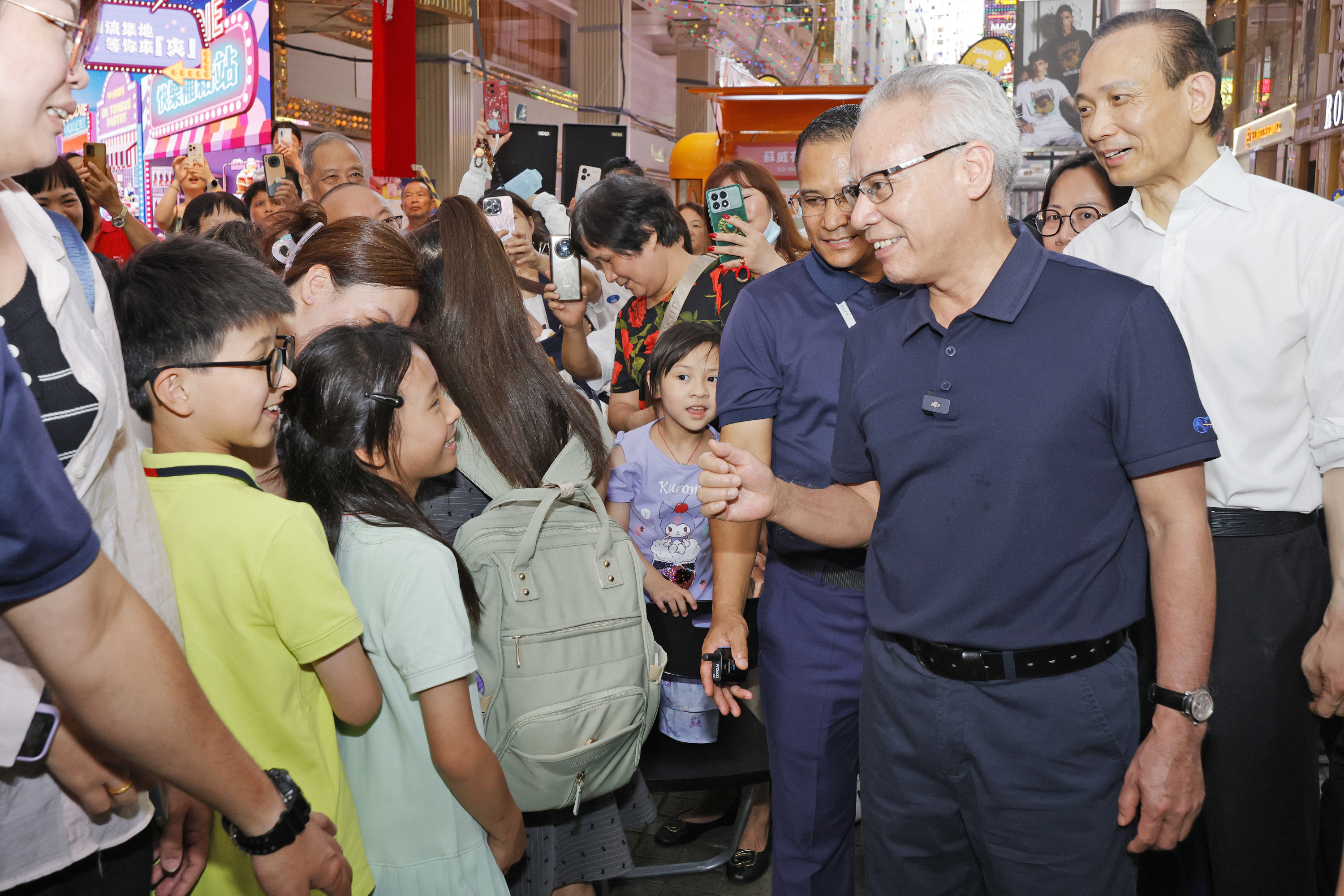 “尋味新口岸市集”自8月15日起一連十天在新口岸廣州街及上海街舉行。岑浩輝下午在經濟財政司司長戴建業陪同下,實地了解市集在假日的引流情況,期間與包括新口岸商戶在內的攤位經營者交流,藉此總結活動經驗,並參考持份者意見,想方設法推動該區經濟發展。走訪市集期間,他購買了澳門文創商品,支持本地消費。此外,他不時與到訪市集的居民和旅客親切互動,共享活動的熱鬧氣氛。
